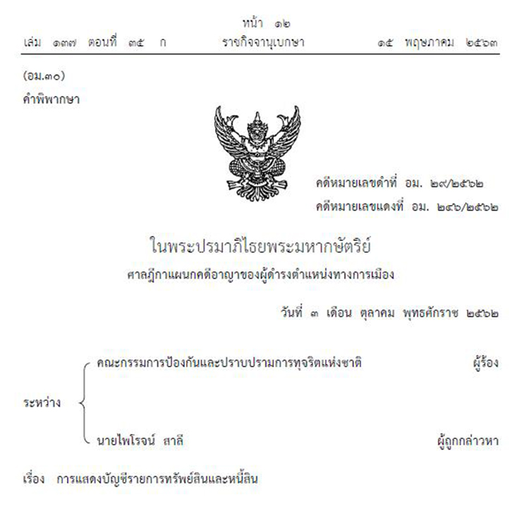 จึงพิพากษาว่า นายไพโรจน์ สาลี ผู้ถูกกล่าวหาจงใจยื่นบัญชีแสดงรายการทรัพย์สินและหนี้สินและเอกสารประกอบต่อคณะกรรมการ ป.ป.ช. ด้วยข้อความอันเป็นเท็จหรือปกปิดข้อเท็จจริงที่ควรแจ้งให้ทราบกรณีเข้ารับตำแหน่งรองนายก อบต. โคกเจริญ ตามพระราชบัญญัติประกอบรัฐธรรมนูญว่าด้วยการป้องกันและปราบปรามการทุจริต พ.ศ. 2542 มาตรา 32 และมาตรา 33 ให้ผู้ถูกกล่าวหาพ้นจากตำแหน่งรองนายก อบต.โคกเจริญ ที่ดำรงอยู่ในปัจจุบันตั้งแต่วันที่ 22 กรกฎาคม 2562 ซึ่งเป็นวันที่ศาลฎีกาแผนกคดีอาญาของผู้ดำรงตำแหน่งทางการเมืองมีคำสั่งให้ผู้ถูกกล่าวหาหยุดปฏิบัติหน้าที่ ตามพระราชบัญญัติประกอบรัฐธรรมนูญว่าด้วยวิธีพิจารณาคดีอาญาของผู้ดำรงตำแหน่งทางการเมือง พ.ศ. 2560 มาตรา 17 วรรคสอง และห้ามมิให้ผู้ถูกกล่าวหาดำรงตำแหน่งทางการเมืองหรือดำรงตำแหน่งใดในพรรคการเมืองเป็นเวลาห้าปีนับแต่วันที่ 3 ตุลาคม 2562 ซึ่งเป็นวันที่ศาลฎีกาแผนกคดีอาญาของผู้ดำรงตำแหน่งทางการเมืองวินิจฉัย ตามพระราชบัญญัติประกอบรัฐธรรมนูญว่าด้วยการป้องกันและปราบปรามการทุจริต พ.ศ.2542 มาตรา 34 วรรคหนึ่ง กับมีความผิดตามพระราชบัญญัติประกอบรัฐธรรมนูญว่าด้วยการป้องกันและปราบปรามการทุจริต พ.ศ. 2542 มาตรา 119 จำคุก 2 เดือน และปรับ 8,000 บาท ผู้ถูกกล่าวหาให้การรับสารภาพ เป็นประโยชน์แก่การพิจารณา มีเหตุบรรเทาโทษลดโทษให้กึ่งหนึ่ง คงจำคุก 1 เดือน และปรับ 4,000 บาท ไม่ปรากฏว่าผู้ถูกกล่าวหาเคยได้รับโทษจำคุกมาก่อน โทษจำคุกจึงให้รอการลงโทษไว้มีกำหนด 1 ปี คำขออื่นนอกจากนี้ให้ยก. (คดีหมายเลขแดงที่ อม.246/2562 วันที่ 3 ต.ค.2562)