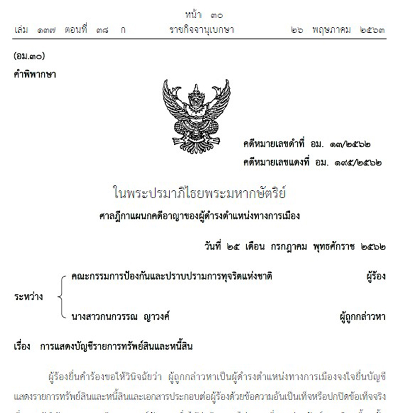 พิพากษาว่า นางสาวกนกวรรณ ญาวงค์ ผู้ถูกกล่าวหาจงใจยื่นบัญชีแสดงรายการทรัพย์สินและหนี้สินและเอกสารประกอบต่อคณะกรรมการ ป.ป.ช. ด้วยข้อความอันเป็นเท็จหรือปกปิดข้อเท็จจริงที่ควรแจ้งให้ทราบกรณีเข้ารับตำแหน่งนายกองค์การบริหารส่วนตำบลคำเขื่อนแก้ว ตามพระราชบัญญัติประกอบรัฐธรรมนูญว่าด้วยการป้องกันและปราบปรามการทุจริต พ.ศ. 2542 มาตรา 32 และมาตรา 33 ให้ผู้ถูกกล่าวหาพ้นจากตำแหน่งนายก อบต.คำเขื่อนแก้วที่ดำรงอยู่ในปัจจุบันนับแต่วันที่ 21 พฤษภาคม 2562 ซึ่งเป็นวันที่ศาลฎีกาแผนกคดีอาญาของผู้ดำรงตำแหน่งทางการเมืองมีคำสั่งให้ผู้ถูกกล่าวหาหยุดปฏิบัติหน้าที่ ตามพระราชบัญญัติประกอบรัฐธรรมนูญว่าด้วยวิธีพิจารณาคดีอาญาของผู้ดำรงตำแหน่งทางการเมือง พ.ศ. 2560 มาตรา 17 วรรคสองและห้ามมิให้ผู้ถูกกล่าวหาดำรงตำแหน่งทางการเมืองหรือดำรงตำแหน่งใดในพรรคการเมืองเป็นเวลาห้าปีนับแต่วันที่ 25 กรกฎาคม 2562 ซึ่งเป็นวันที่ศาลฎีกาแผนกคดีอาญาของผู้ดำรงตำแหน่งทางการเมืองวินิจฉัย ตามพระราชบัญญัติประกอบรัฐธรรมนูญว่าด้วยการป้องกันและปราบปรามการทุจริตพ.ศ. 2542 มาตรา 34 วรรคหนึ่ง กับมีความผิดตามพระราชบัญญัติประกอบรัฐธรรมนูญว่าด้วยการป้องกันและปราบปรามการทุจริต พ.ศ. 2542 มาตรา 119 จำคุก 2 เดือน และปรับ 8,000 บาท ผู้ถูกกล่าวหาให้การรับสารภาพ เป็นประโยชน์แก่การพิจารณา มีเหตุบรรเทาโทษ ลดโทษให้กึ่งหนึ่งตามประมวลกฎหมายอาญา มาตรา 78 คงจำคุก 1 เดือน และปรับ 4,000 บาท ไม่ปรากฏว่าผู้ถูกกล่าวหาเคยได้รับโทษจำคุกมาก่อน โทษจำคุกจึงให้รอการลงโทษไว้มีกำหนด 1 ปี คำขออื่นนอกจากนี้ให้ยก. (คดีหมายเลขแดงที่ อม.195/2562 วันที่ 25 ก.ค.562)