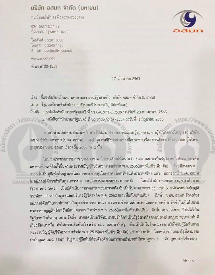 ประธานบอร์ด อสมท ร่อนหนังสือแจง ‘เทวัญ’ ยกข้อกฎหมายยันรัฐไม่มีอำนาจสั่งตรวจสอบผู้บริหารสูงสุด อสมท กรณีเงินเยียวยาคลื่น 2600 MHz กว่า 3.2 พันล้านบาทได้ เบรกสหภาพฯ อสมท ไม่สมควรก้าวก่ายบริหารจัดการภายใน