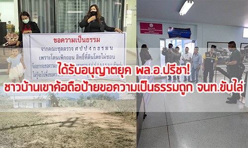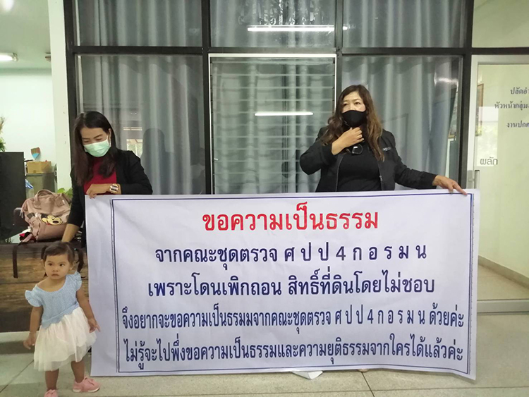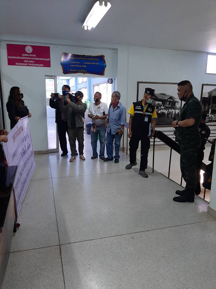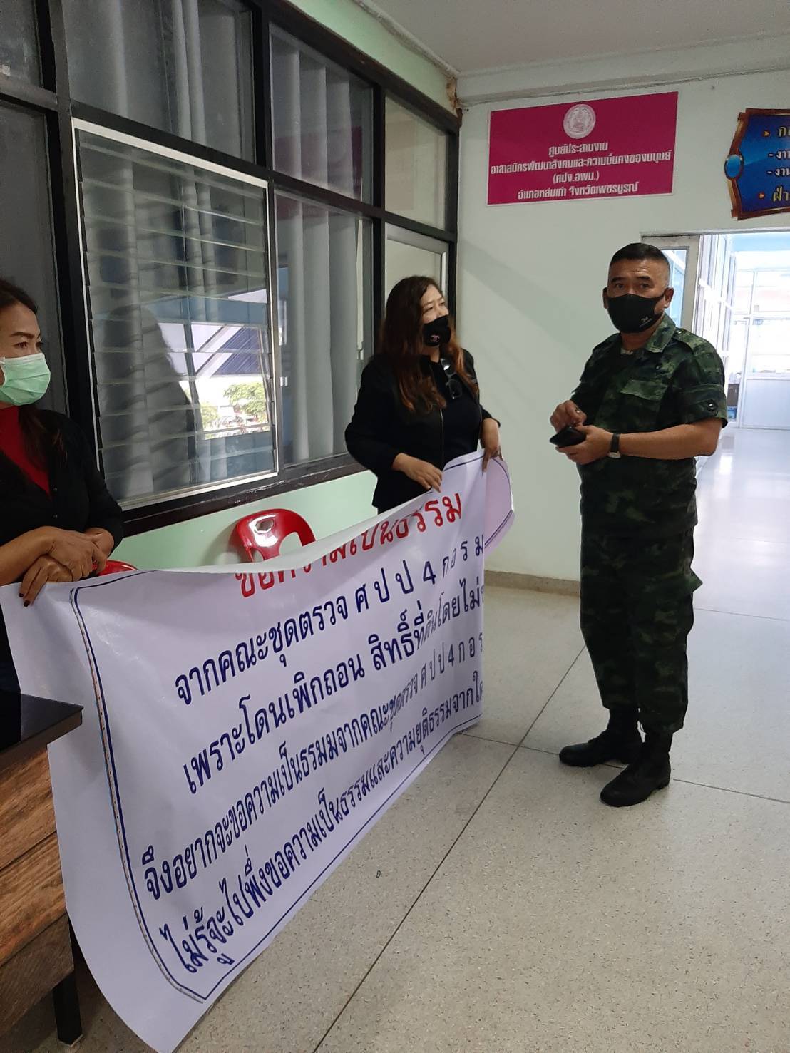 ชาวบ้านเขาค้อ จ.เพชรบูรณ์ ทายาท รอส. ยืนถือป้ายในพื้นที่ที่ว่าการอำเภอ ร้องขอความเป็นธรรม ศปป.4 กอ.รมน. ปมที่ดินถูกเจ้าหน้าที่ยกเลิก ขับไล่ ทั้งที่ได้รับอนุญาตจากทัพภาค 3 ยุค พล.ท.ปรีชา จันทร์โอชา ปี 56 ยื่นสำนักปลัดฯแต่เงียบ ตอนนี้เป็นตลาดนัด