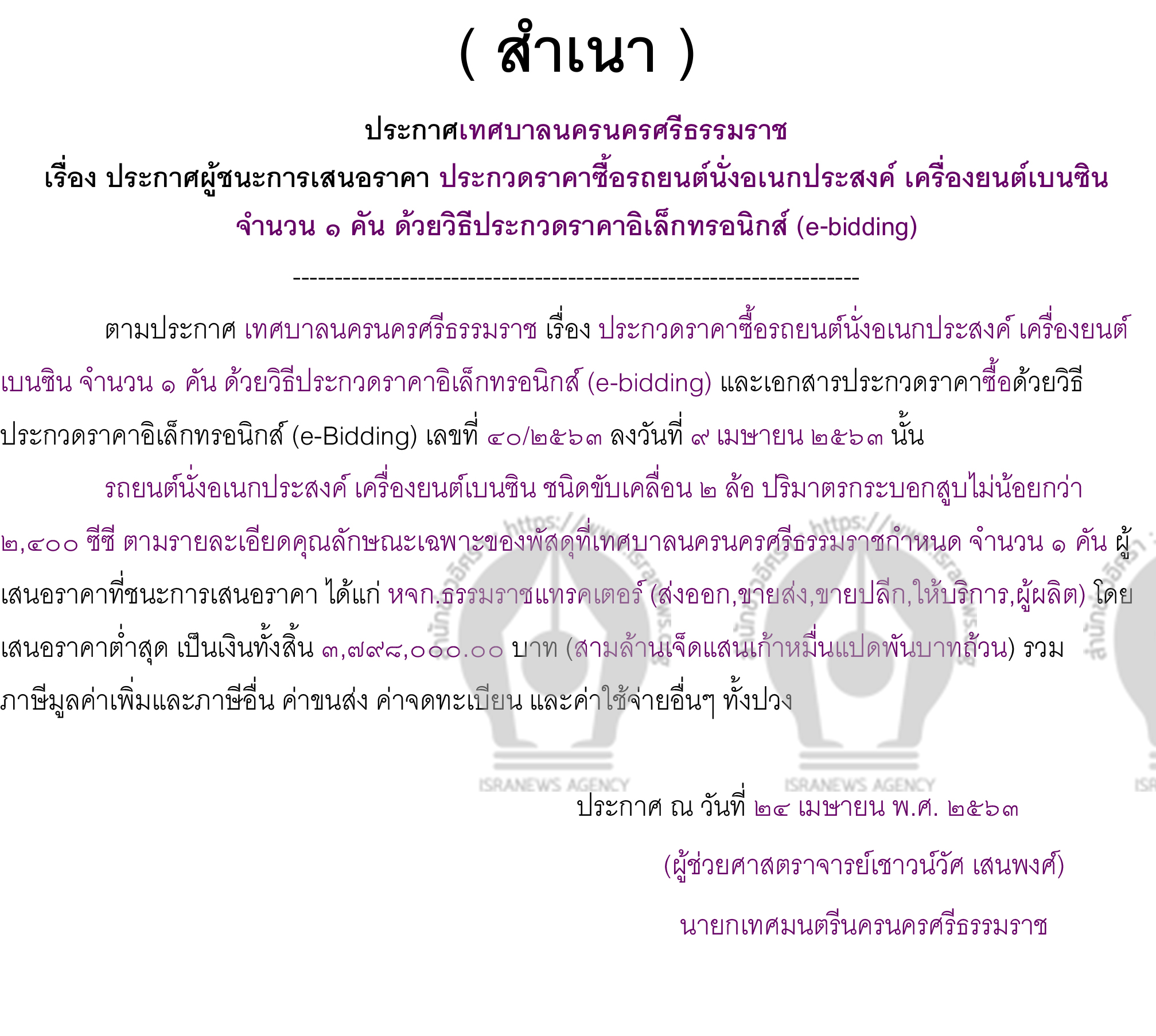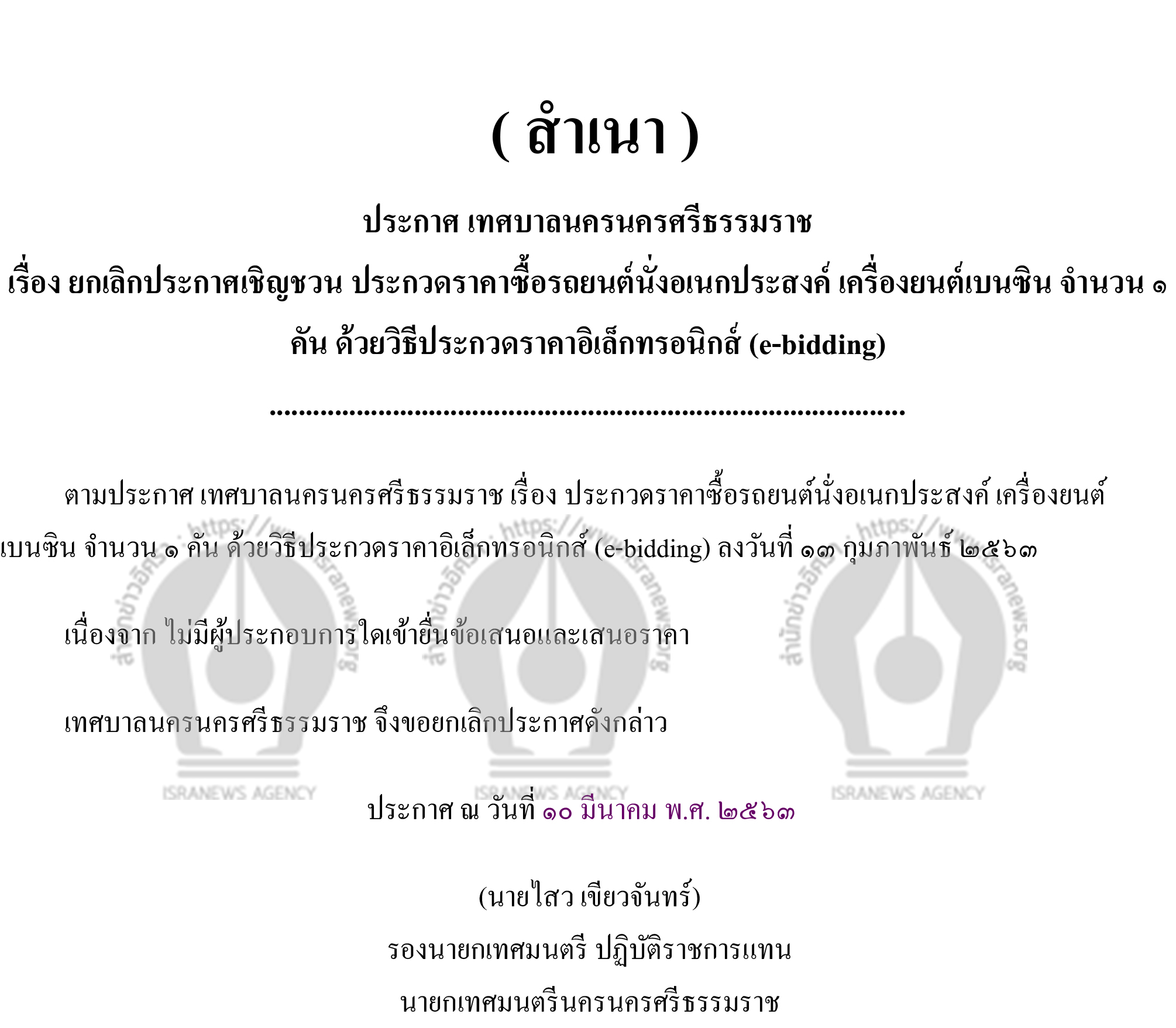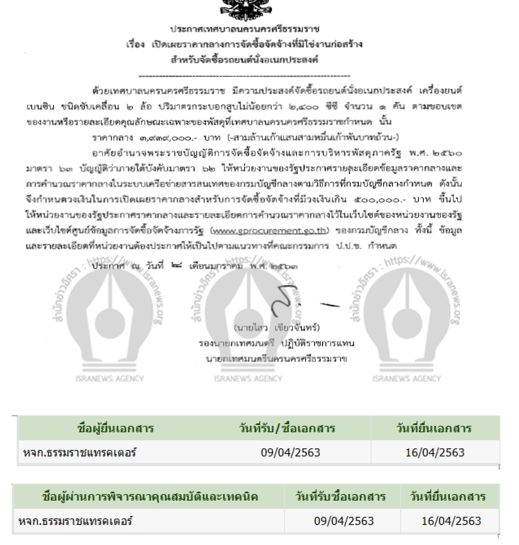กรณีดังกล่าวสำนักข่าวอิศรา (www.isranews.org) ตรวจสอบพบว่า การจัดซื้อรถยนต์ดังกล่าว เทศบาลนครนครศรีธรรมราชเคยออกประกาศประกวดราคามาครึ่งหนึ่งแล้วเมื่อวันที่ 13 กุมภาพันธ์ 2563 วงเงิน 3,939,000 บาท แต่ได้ยกเลิกการประกวดราคา เมื่อวันที่ 10 มี.ค.2563 โดยอ้างว่า ไม่มีผู้ประกอบการใดเข้ายื่นข้อเสนอและเสนอราคา (ดูเอกสาร)