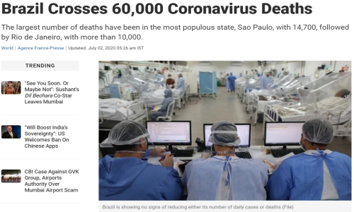 ทวีปอเมริกาใต้ บราซิล มียอดผู้ติดเชื้ออันดับ 1 ของทวีปและเป็นอันดับ 2 ของโลก จำนวนผู้ติดเชื้อมีทั้งสิ้น 1,453,369 ราย ติดเชื้อใหม่ 44,884 ราย เสียชีวิต 60,713 ราย เสียชีวิตใหม่ 1,057 ราย ทำให้บราซิลมียอดผู้เสียชีวิตใหม่สูงที่สุดในโลก
