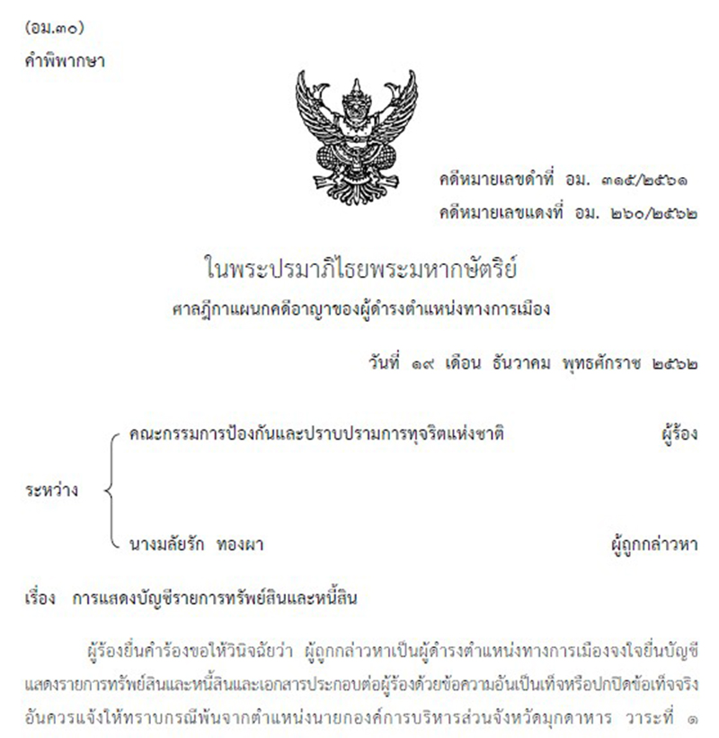 สำนักข่าวอิศรา www.isranews.org รายงานว่า ราชกิจจานุเบกษา วันที่ 10 ก.ค. 2563 เผยแพร่คำพิพากษาศาลฎีกาแผนกคดีอาญาของผู้ดำรงตำแหน่งทางการเมือง คดีการแสดงบัญชีรายการทรัพย์สินและหนี้สิน โดยคณะกรรมการป้องกันและปราบปรามการทุจริตแห่งชาติ (คณะกรรมการ ป.ป.ช.) ผู้ร้องราย นางมลัยรัก ทองผา นายกองค์การบริหารส่วนจังหวัด (อบจ.) มุกดาหาร จงใจยื่นบัญชีแสดงรายการทรัพย์สินและหนี้สินและเอกสารประกอบต่อผู้ร้องด้วยข้อความอันเป็นเท็จหรือปกปิดข้อเท็จจริงอันควรแจ้งให้ทราบ ได้ตัวผู้ถูกกล่าวหามายังศาลเกินกว่า 5 ปี นับแต่วันกระทำความผิด คดีส่วนอาญาจึงเป็นอันขาดอายุความ พิพากษายกคำร้อง รายละเอียดดังนี้