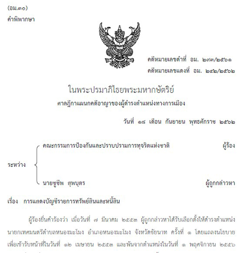 ให้พ้นตำแหน่ง!ศาลฎีกาฯคุก 1 เดือน รองนายก อบต. จ.สุโขทัย ยื่นเท็จ รอลงโทษ 1 ปี