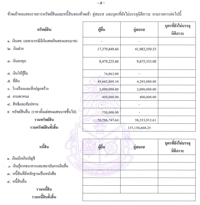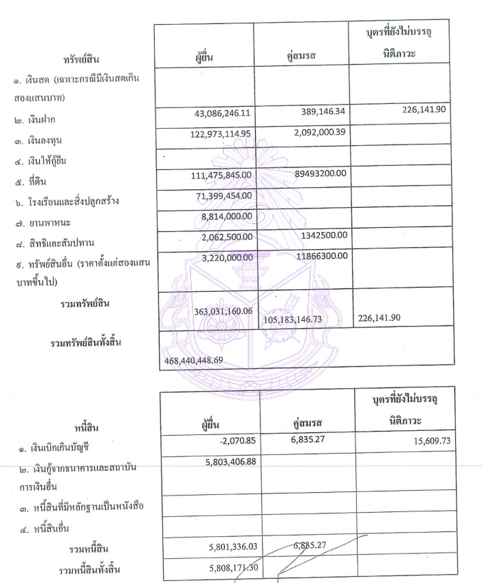 รวมทั้งคู่มีทรัพย์สินทั้งสิ้น 468,440,448 บาท มีหนี้สิน 5,808,171 บาท