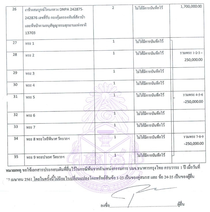 นอกจากนี้ยังแจ้งครอบครองงาช้างสมบูรณ์โคนกลวง DNPA 242875-242876 เลขที่รับกองคุ้มครองพันธุ์สัตว์ป่าและพืชป่าตามอนุสัญญากรมอุทยานแห่งชาติ 13703 จำนวน 2 กิ่ง ไม่ได้บันทึกวันเวลาที่ได้มา มูลค่ารวม 1.7 ล้านบาท