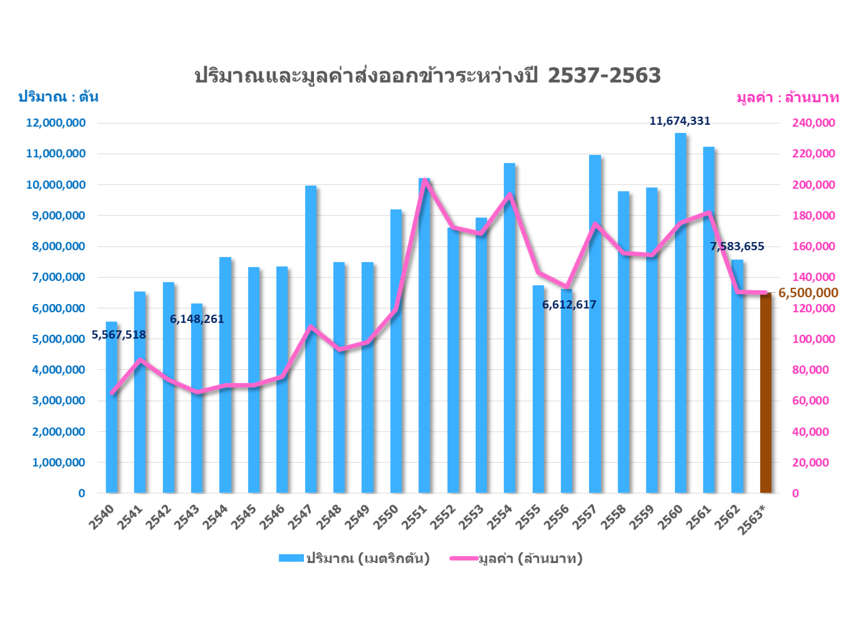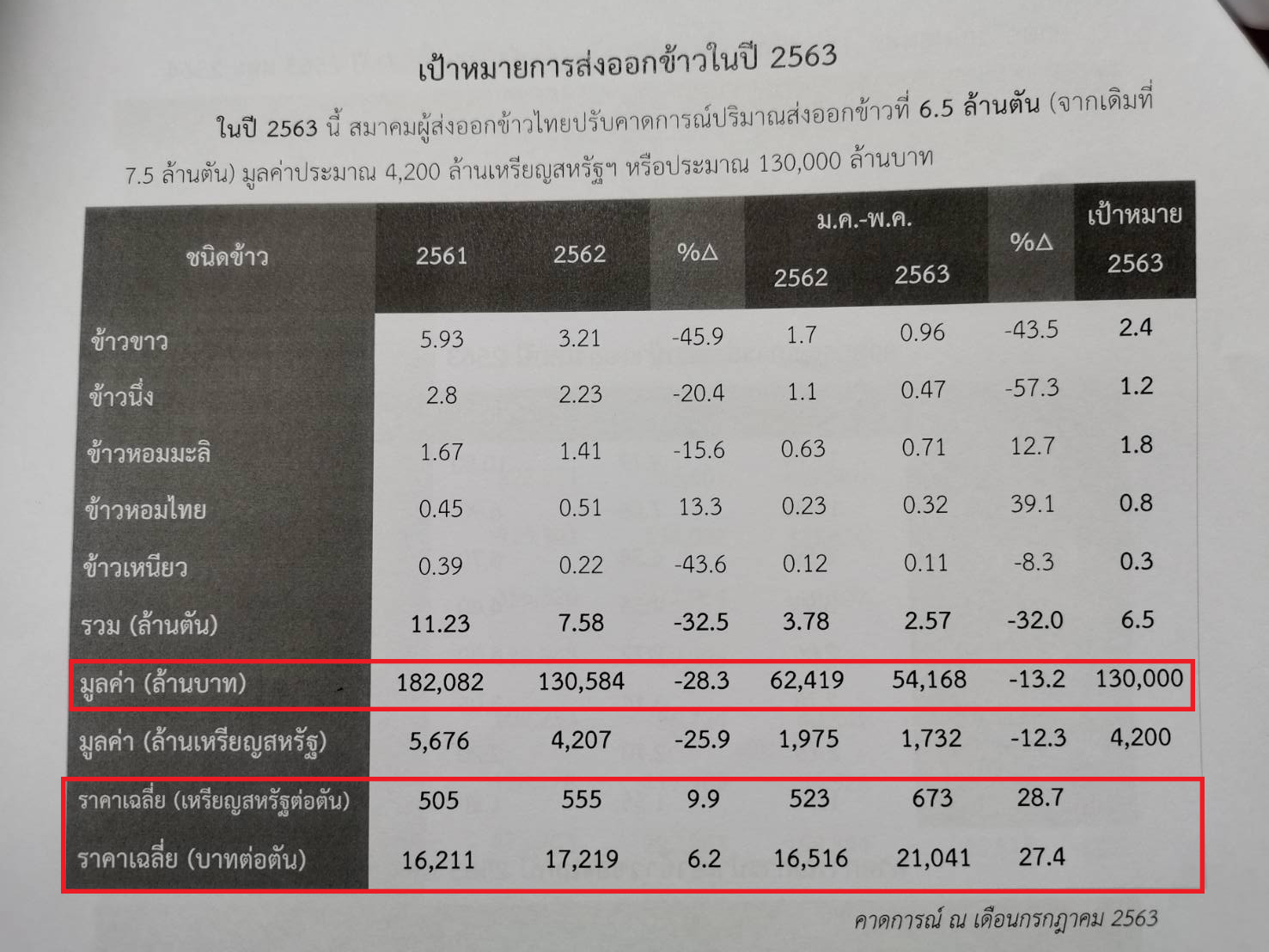 “แม้ว่าไทยจะส่งออกข้าวได้ในปริมาณต่ำสุดในรอบ 20 ปี หรือนับตั้งแต่ปี 43 แต่เนื่องจากราคาต่อหน่วยของข้าวไทยสูงขึ้น โดยเฉพาะในช่วง 5 เดือนของปีนี้ (ม.ค.-พ.ค.63) ไทยขายข้าวได้เฉลี่ย 21,041 บาทต่อตัน หรือที่ 673 ดอลลาร์สหรัฐต่อตัน เทียบกับช่วงเดียวกันของปีก่อนที่ขายได้ 16,516 บาทต่อตัน หรือ 523 ดอลลาร์สหรัฐต่อตัน จึงคาดว่ามูลค่าส่งออกข้าวไทยจะอยู่ที่ 4,200 ล้านดอลลาร์สหรัฐ หรือกว่า 1.3 แสนล้านบาท ใกล้เคียงกับปีที่แล้ว” นายชูเกียรติกล่าว