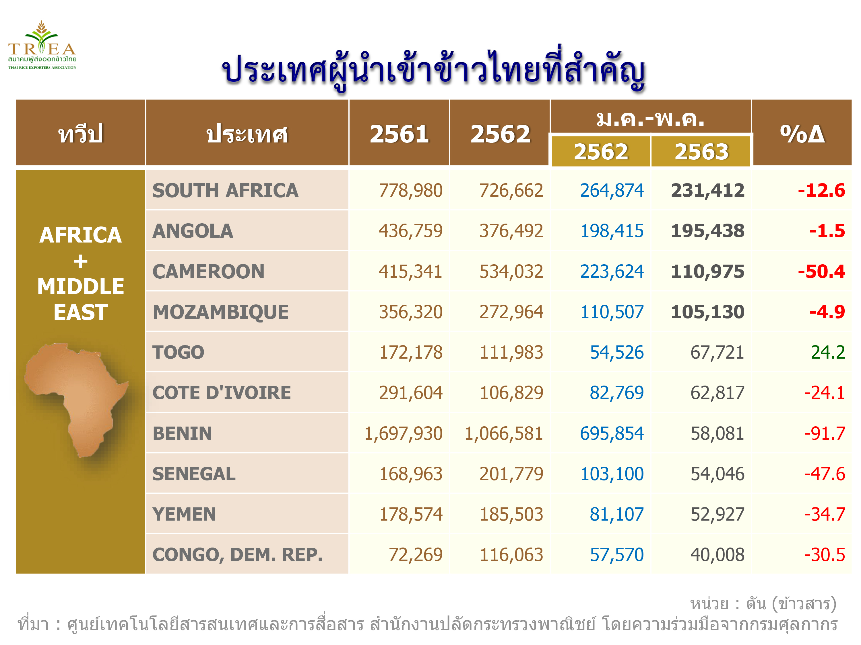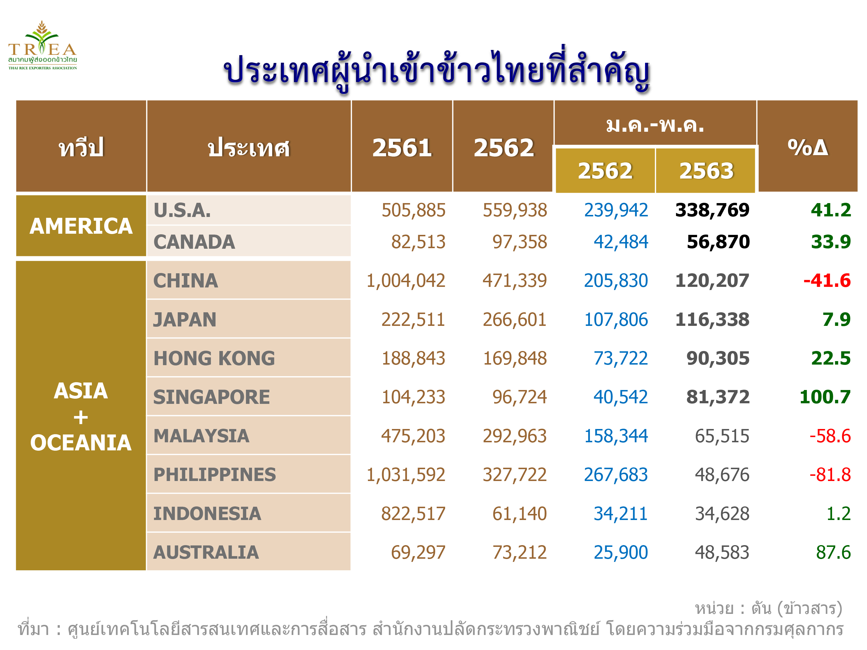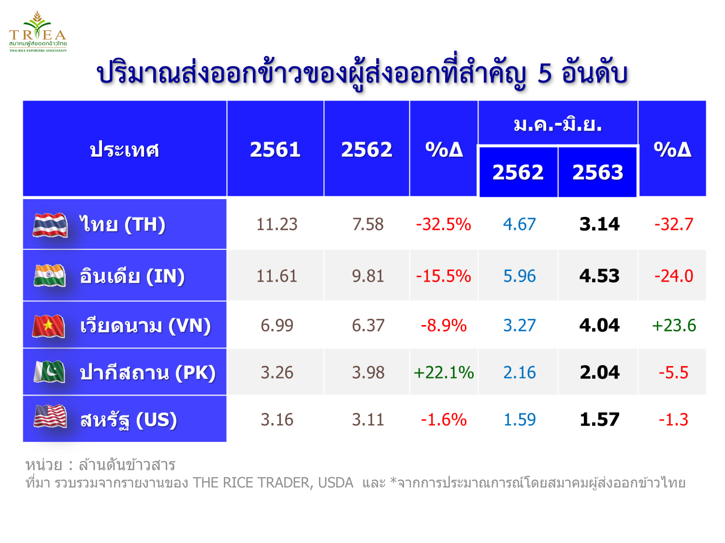 ด้านนายโชคชัย เศรษฐีวรรณ อุปนายกสมาคมส่งออกข้าวไทย กล่าวว่า ในช่วง 6 เดือนของปีนี้ (ม.ค.-มิ.ย.63) ไทยส่งออกข้าวได้แล้ว 3.14 ล้านตัน ลดลง 32.7% เมื่อเทียบกับช่วงเดียวกันของปีก่อน อินเดียส่งออกข้าวได้ 4.53 ล้านตัน ลดลง 24% เวียดนามส่งออกข้าวได้ 4.04 ล้านตัน เพิ่มขึ้น 23.6% ปากีสถานส่งออกข้าวได้ 2.04 ล้านตัน ลดลง 5.5% และสหรัฐส่งออกข้าวได้ 1.59 ล้านตัน ลดลง 1.3% ส่วนจีนยังไม่มีรายงานตัวเลขออกมา แต่คาดว่าน่าจะอยู่ที่ 1.5 ล้านตัน