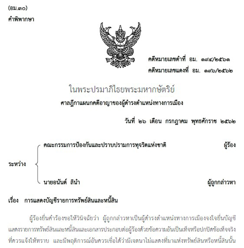 พิพากษาว่า นายอนันต์ ลินำ ผู้ถูกกล่าวหาจงใจยื่นบัญชีแสดงรายการทรัพย์สินและหนี้สินและเอกสารประกอบต่อคณะกรรมการ ป.ป.ช. ด้วยข้อความอันเป็นเท็จหรือปกปิดข้อเท็จจริงที่ควรแจ้งให้ทราบ กรณีพ้นจากตำแหน่งนายก อบต.วังหมัน ตามพระราชบัญญัติ ประกอบรัฐธรรมนูญว่าด้วยการป้องกันและปราบปรามการทุจริต พ.ศ. 2542 มาตรา 32 และมาตรา 33 ห้ามมิให้ผู้ถูกกล่าวหาดำรงตำแหน่งทางการเมืองหรือดำรงตำแหน่งใดในพรรคการเมือง เป็นเวลาห้าปีนับแต่วันที่ 6 กันยายน 2556 ซึ่งเป็นวันที่ผู้ถูกกล่าวหาพ้นจากตำ แหน่งตามพระราชบัญญัติประกอบรัฐธรรมนูญว่าด้วยการป้องกันและปราบปรามการทุจริต พ.ศ. 2542 มาตรา 34 วรรคสอง กับมีความผิดตามพระราชบัญญัติประกอบรัฐธรรมนูญว่าด้วยการป้องกันและปราบปรามการทุจริต พ.ศ. 2542 มาตรา 119 ฐานเป็นเจ้าหน้าที่ของรัฐจงใจยื่นบัญชีแสดงรายการทรัพย์สินและหนี้สินและเอกสารประกอบต่อคณะกรรมการ ป.ป.ช. ด้วยข้อความอันเป็นเท็จหรือปกปิดข้อเท็จจริงที่ควรแจ้งให้ทราบกรณีพ้นจากตำแหน่ง จำคุก 2 เดือน และปรับ 8,000 บาท ผู้ถูกกล่าวหาให้การรับสารภาพ เป็นประโยชน์แก่การพิจารณา มีเหตุบรรเทาโทษ ลดโทษให้กึ่งหนึ่งตามประมวลกฎหมายอาญา มาตรา 78 คงจำคุก 1 เดือน และปรับ 4,000 บาท ไม่ปรากฏว่าผู้ถูกกล่าวหาเคยได้รับโทษจำคุกมาก่อน โทษจำคุกจึงให้รอการลงโทษไว้มีกำหนด 1 ปี ข้อหาและคำขออื่นนอกจากนี้ให้ยก. (คดีหมายเลขแดงที่ อม. 196/2562 วันที่ 26 กรกฎาค2562 )