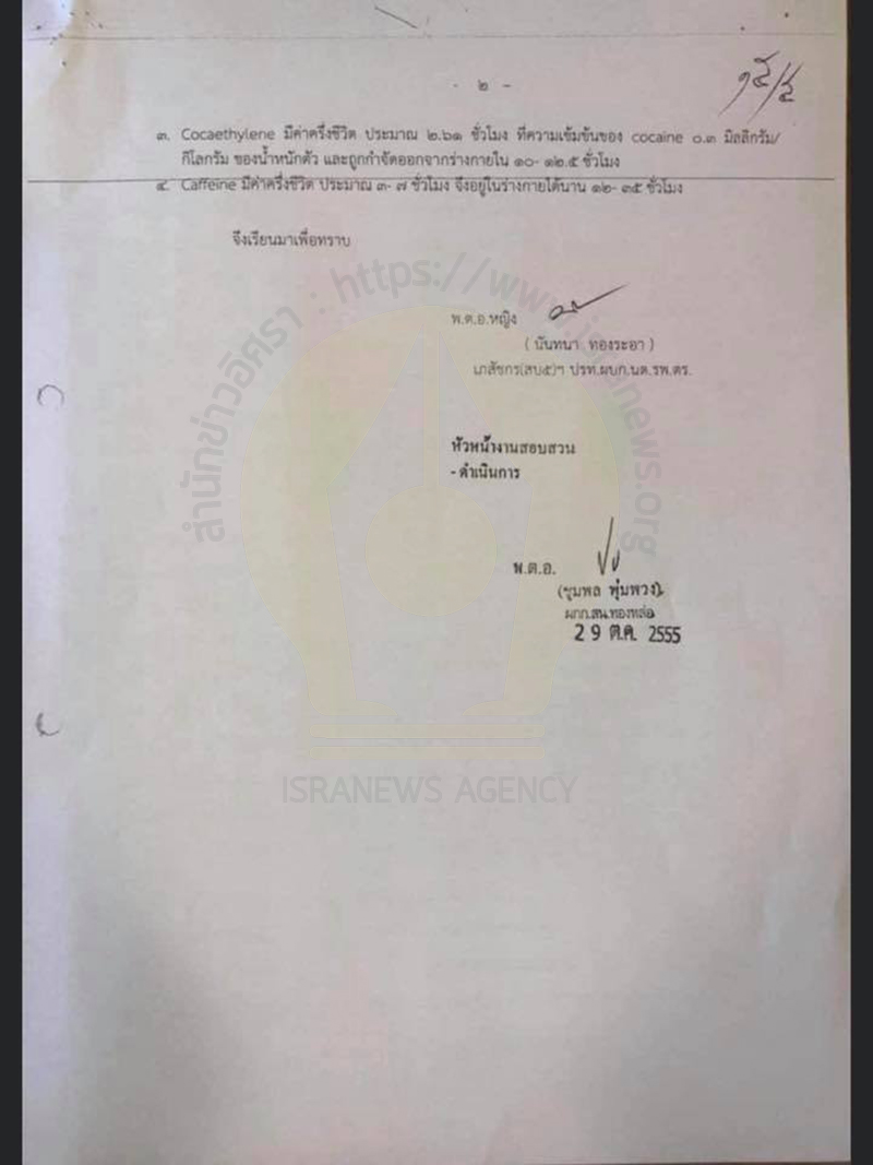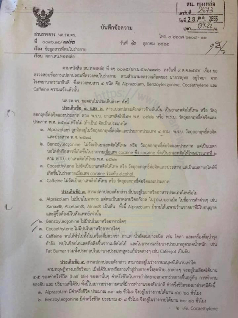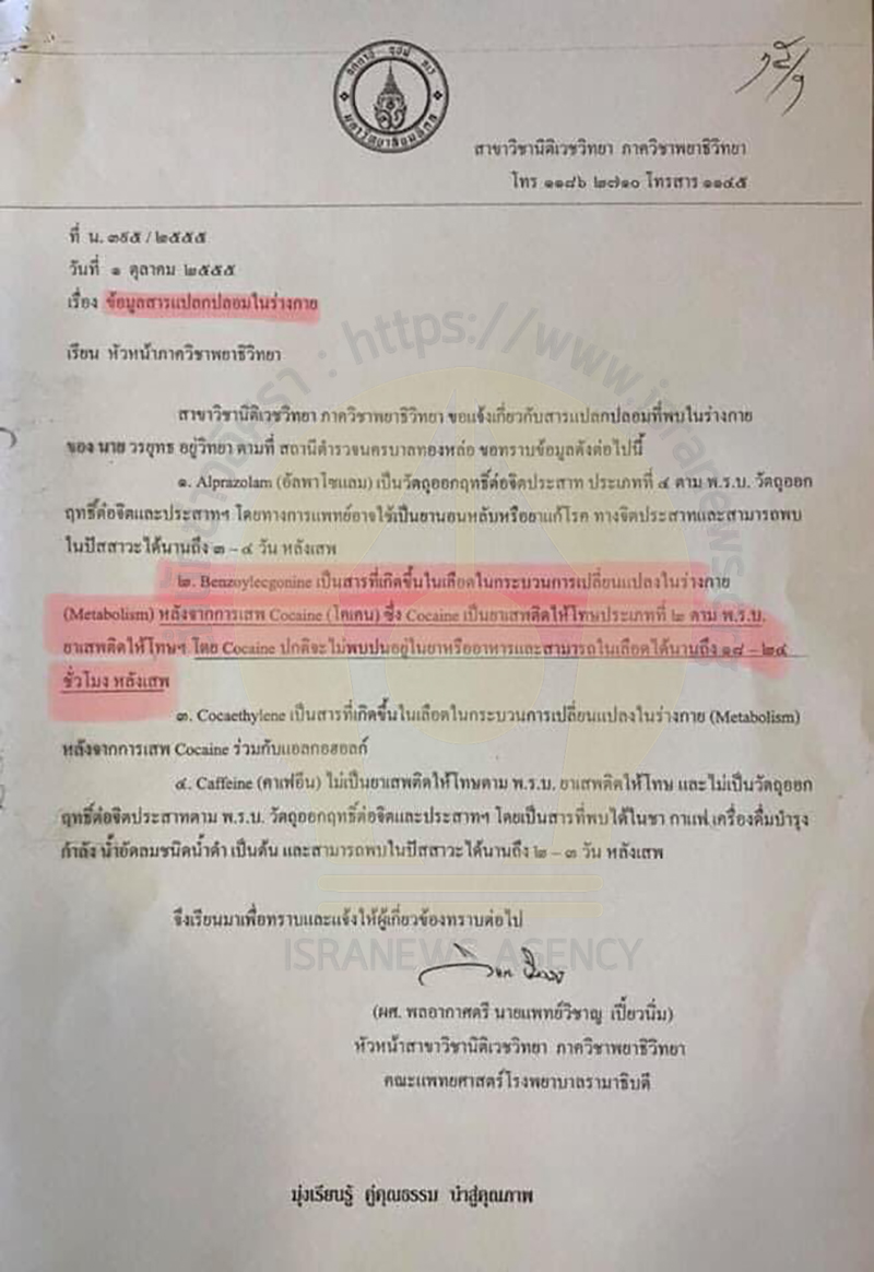 สำนักข่าวอิศรา (www.isranews.org) รายงานว่า เมื่อวันที่ 1 ส.ค. นพ.แท้จริง ศิริพานิช เลขาธิการมูลนิธิเมาไม่ขับ โพสต์ภาพผ่าน แท้จริง ศิริพานิช ซึ่งเป็นบันทึกข้อความ ลงวันที่ 16 ต.ค.2555 จากสถาบันนิติเวชวิทยา โรงพยาบาลตำรวจ (นต.รพ.ตร.) ส่งถึงผู้กำกับการสถานีตำรวจนครบาลทองหล่อ (สน.ทองหล่อ) โดยเนื้อหาตอนหนึ่ง ระบุว่า ตามหนังสือ สน.ทองหล่อ ที่ ตช. 0015 (บก.น.5)3/1370 ลงวันที่ 9 ต.ค.2555 เรื่องขอตรวจสอบชื่อสารแปลกปลมที่ตรวจสอบในร่างกาย ตามสำเนาผลตรวจเลือดของ นายวรยุทธ อยู่วิทยา หรือ บอส ที่ขับรถชนตำรวจเสียชีวิตเมือ่ปี 2555 โดยเป็นผลตรวจเลือดที่ดำเนินการโดยโรงพยาบาลรามาธิบดี พบสาร 4 ชนิด คือ Alprazolam , Benzoylecgonine , Cocaethylene และ Coaffeine