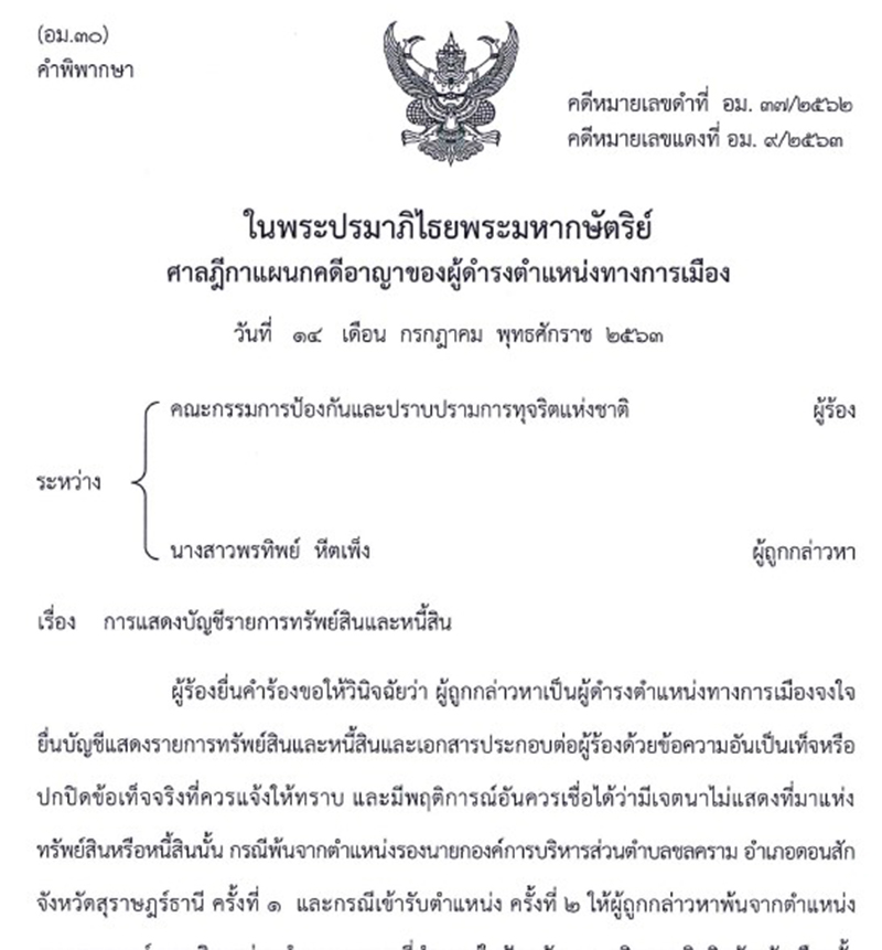 พิพากษาว่า นางสาวพรทิพย์ หีตเพ็ง ผู้ถูกกล่าวหา จงใจยื่นบัญชีแสดงรายการ ทรัพย์สินและหนี้สินและเอกสารประกอบต่อคณะกรรมการ ป.ป.ช. ด้วยข้อความอันเป็นเท็จหรือ ปกปิดข้อเท็จจริงที่ควรแจ้งให้ทราบกรณีพ้นจากตําแหน่ง ครั้งที่ 1 และกรณีเข้ารับตําแหน่ง ครั้งที่ 2 ในการดํารงตําแหน่งรองนายกองค์การบริหารส่วนตําบลชลคราม อําเภอดอนสัก จังหวัดสุราษฎร์ธานี ตามพระราชบัญญัติประกอบรัฐธรรมนูญว่าด้วยการป้องกันและปราบปรามการทุจริต พ.ศ. 2542 มาตรา 32 และมาตรา 33 ให้ผู้ถูกกล่าวหาพ้นจากตําแหน่งรองนายกองค์การบริหารส่วนตําบล ชลครามนับแต่วันที่ 22 มกราคม 2563 ซึ่งเป็นวันที่ศาลฎีกาแผนกคดีอาญาของผู้ดํารงตําแหน่ง ทางการเมืองมีคําสั่งให้ผู้ถูกกล่าวหาหยุดปฏิบัติหน้าที่ ตามพระราชบัญญัติประกอบรัฐธรรมนูญว่า ด้วยวิธีพิจารณาคดีอาญาของผู้ดํารงตําแหน่งทางการเมือง พ.ศ.2560 มาตรา 17 วรรคสอง และ ห้ามมิให้ผู้ถูกกล่าวหาดํารงตําแหน่งทางการเมืองหรือดํารงตําแหน่งใดในพรรคการเมืองเป็นเวลาห้า ปีนับแต่วันที่ 14 กรกฎาคม 2563 ซึ่งเป็นวันที่ศาลฎีกาแผนกคดีอาญาของผู้ดํารงตําแหน่งทางการเมืองวินิจฉัย ตามพระราชบัญญัติประกอบรัฐธรรมนูญว่าด้วยการป้องกันและปราบปรามการ ทุจริต พ.ศ. 2542 มาตรา 34 วรรคหนึ่ง กับมีความผิดตามพระราชบัญญัติประกอบรัฐธรรมนูญว่าด้วยการป้องกันและปราบปรามการทุจริต พ.ศ. 2542 มาตรา 119 ฐานเป็นเจ้าหน้าที่ของรัฐ จงใจยื่นบัญชีแสดงรายการทรัพย์สินและหนี้สินและเอกสารประกอบต่อคณะกรรมการ ป.ป.ช. ด้วยข้อความอันเป็นเท็จหรือปกปิดข้อเท็จจริงที่ควรแจ้งให้ทราบ กรณีพ้นจากตําแหน่ง ครั้งที่ 1 และกรณีเข้ารับตําแหน่ง ครั้งที่ 2 การกระทําของผู้ถูกกล่าวหาเป็นความผิดหลายกรรมต่างกัน ให้ลงโทษทุกกรรมเป็นกระทงความผิดไปตามประมวลกฎหมายอาญา มาตรา 91 จําคุกกระทงละ 2 เดือน และปรับกระทงละ 8,000 บาท รวม 2 กระทง เป็นจําคุก 4 เดือน และปรับ 16,000 บาท ผู้ถูกกล่าวหาให้การรับสารภาพ เป็นประโยชน์แก่การพิจารณา มีเหตุบรรเทาโทษ ลดโทษให้กึ่งหนึ่ง ตามประมวลกฎหมายอาญา มาตรา 78 คงจําคุก 2 เดือน และปรับ 8,000 บาท ไม่ปรากฏว่า ผู้ถูกกล่าวหาเคยได้รับโทษจําคุกมาก่อน โทษจําคุกจึงให้รอการลงโทษไว้มีกําหนด 1 ปี ตามประมวล กฎหมายอาญา มาตรา 56 ไม่ชําระค่าปรับให้จัดการตามประมวลกฎหมายอาญา มาตรา 29,30 (คดีหมายเลขแดงที่ อม.9 /2563 วันที่ 14 ก.ค.2563)
