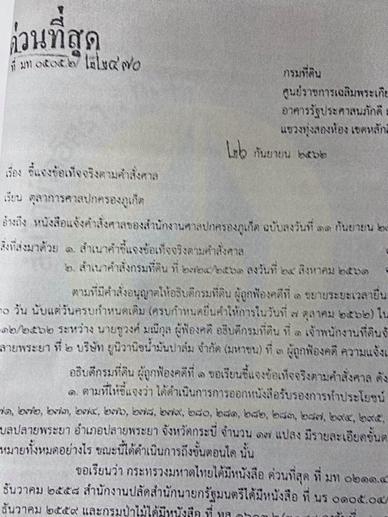 สำนักข่าวอิศรารายงานว่า ที่มาของการส่งหนังสือชี้แจงต่อศาลปกครองภูเก็ตของกรมที่ดินสืบเนื่องมาจาก นายชูวงศ์ มณีกุล ได้ฟ้องกรมที่ดิน ที่ 1 เจ้าพนักงานที่ดินจังหวัดกระบี่ สาขาปลายพระยา ที่ 2 บริษัท ยูนิวานิชน้ํามันปาล์ม จํากัด (มหาชน) ที่ 3 ผู้ถูกฟ้องคดี ต่อศาลปกครองนครศรีธรรมราชตามคดีหมายเลขดํา ที่ 62/2560 ลงวันที่ 17 มีนาคม 2560 และต่อมาได้โอนคดีไปยังศาลปกครองภูเก็ต ซึ่งศาลได้แจ้งให้กรมที่ดินจัดทําคําให้การเพิ่มเติม และกรมที่ดินได้มีหนังสือ ด่วนที่สุด ลงวันที่ 26 กันยายน 2562 จัดส่งคําให้การเพิ่มเติมให้ศาลทราบดังกล่าว ขณะนี้อยู่ระหว่างการพิจารณาคดีของศาลปกครองภูเก็ต