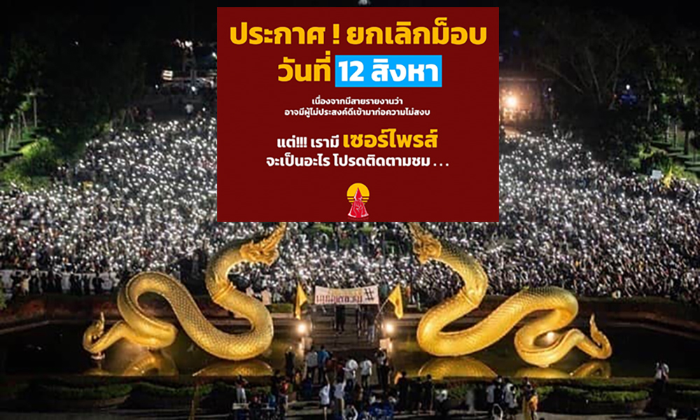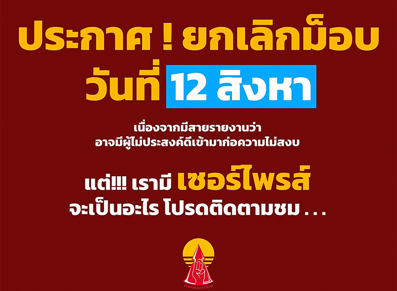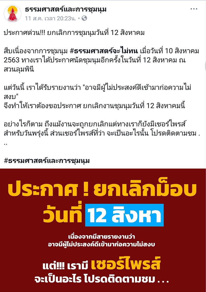 แฟนเพจเฟซบุ๊ก 'ธรรมศาสตร์และการชุมนุม' ประกาศยกเลิกการชุมนุมวันที่ 12 สิงหาคม อ้างมีผู้ไม่ประสงค์ดีก่อความไม่สงบ