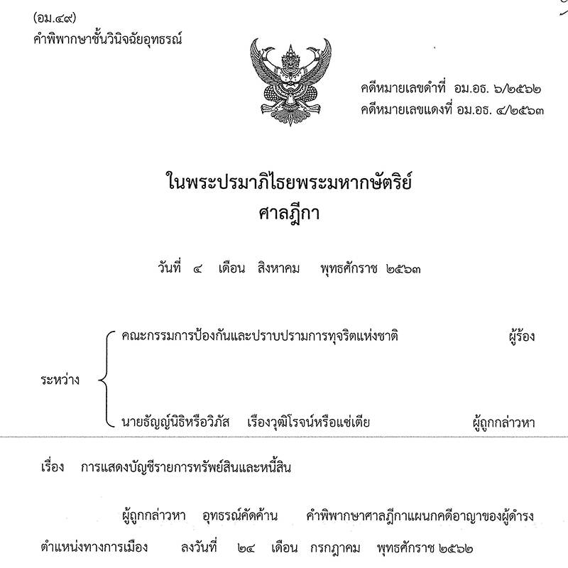 ศาลฎีกาแผนกคดีอาญาของผู้ดํารงตําแหน่งทางการเมืองพิพากษาว่า นายธัญญ์นิธิ หรือวิภัส เรืองวุฒิโรจน์หรือแซ่เตีย ผู้ถูกกล่าวหา จงใจยื่นบัญชีแสดงรายการทรัพย์สินและหนี้สินและเอกสารประกอบต่อผู้ร้องด้วยข้อความอันเป็นเท็จหรือปกปิดข้อเท็จจริงที่ควรแจ้งให้ทราบ กรณีเข้ารับตําแหน่งและกรณีพ้นจากตําแหน่งนายกองค์การบริหารส่วนตําบลหนองหญ้าลาด อําเภอ กันทรลักษ์ จังหวัดศรีสะเกษ ครั้งที่ 1 และกรณีเข้ารับตําแหน่งนายกเทศมนตรีตําบลหนองหญ้าลาด อําเภอกันทรลักษ์ จังหวัดศรีสะเกษ ครั้งที่ 2 ตามพระราชบัญญัติประกอบรัฐธรรมนูญว่าด้วยการ ป้องกันและปราบปรามการทุจริต พ.ศ. 2542 มาตรา 32 และ 33 ให้ผู้ถูกกล่าวหาพ้นจากตําแหน่ง นายกเทศมนตรีตําบลหนองหญ้าลาดที่ดํารงอยู่ในปัจจุบัน นับแต่วันที่ 28 พฤษภาคม 2562 ซึ่งเป็น วันที่ศาลฎีกาแผนกคดีอาญาของผู้ดํารงตําแหน่งทางการเมืองมีคําสั่งให้ผู้ถูกกล่าวหาหยุดปฏิบัติหน้าที่ ตามพระราชบัญญัติประกอบรัฐธรรมนูญว่าด้วยวิธีพิจารณาคดีอาญาของผู้ดํารงตําแหน่งทาง การเมือง พ.ศ. 2560 มาตรา 17 วรรคสอง และห้ามมิให้ผู้ถูกกล่าวหาดํารงตําแหน่งทางการเมือง หรือดํารงตําแหน่งใดในพรรคการเมืองเป็นเวลาห้าปี นับแต่วันที่ 24 กรกฎาคม 2562 ซึ่งเป็นวันที่ ศาลฎีกาแผนกคดีอาญาของผู้ดํารงตําแหน่งทางการเมืองวินิจฉัย ตามพระราชบัญญัติประกอบ รัฐธรรมนูญว่าด้วยการป้องกันและปราบปรามการทุจริต พ.ศ. 2542 มาตรา 34 วรรคหนึ่ง กับมี ความผิดตามพระราชบัญญัติประกอบรัฐธรรมนูญว่าด้วยการป้องกันและปราบปรามการทุจริต พ.ศ. 2542 มาตรา 119 การกระทําของผู้ถูกกล่าวหาเป็นความผิดหลายกรรมต่างกัน ให้ลงโทษทุกกรรม เป็นกระทงความผิดไป ตามประมวลกฎหมายอาญา มาตรา 91 ฐานเป็นเจ้าหน้าที่ของรัฐจงใจยื่น บัญชีแสดงรายการทรัพย์สินและหนี้สินและเอกสารประกอบต่อคณะกรรมการ ป.ป.ช. ด้วยข้อความ อันเป็นเท็จหรือปกปิดข้อเท็จจริงที่ควรแจ้งให้ทราบ กรณีพ้นจากตําแหน่งนายกองค์การบริหารส่วน ตําบลหนองหญ้าลาด ครั้งที่ 1 และกรณีเข้ารับตําแหน่งนายกเทศมนตรีตําบลหนองหญ้าลาด ครั้งที่ 2 จําคุกกระทงละ 2 เดือน และปรับกระทงละ 8,000 บาท รวม 2 กระทง เป็นจําคุก 4 เดือน และปรับ 16,000 บาท ผู้ถูกกล่าวหาให้การรับสารภาพ เป็นประโยชน์แก่การพิจารณา มีเหตุบรรเทาโทษ ลดโทษให้กึ่งหนึ่งตามประมวลกฎหมายอาญา มาตรา 78 คงจําคุก 2 เดือน และปรับ 8,000 บาท ไม่ปรากฏว่าผู้ถูกกล่าวหาเคยได้รับโทษจําคุกมาก่อน โทษจําคุกให้รอการลงโทษไว้มีกําหนด 1 ปี ตาม ประมวลกฎหมายอาญา มาตรา 56 ไม่ชําระค่าปรับให้จัดการตามประมวลกฎหมายอาญา มาตรา 29 , 30 คํ