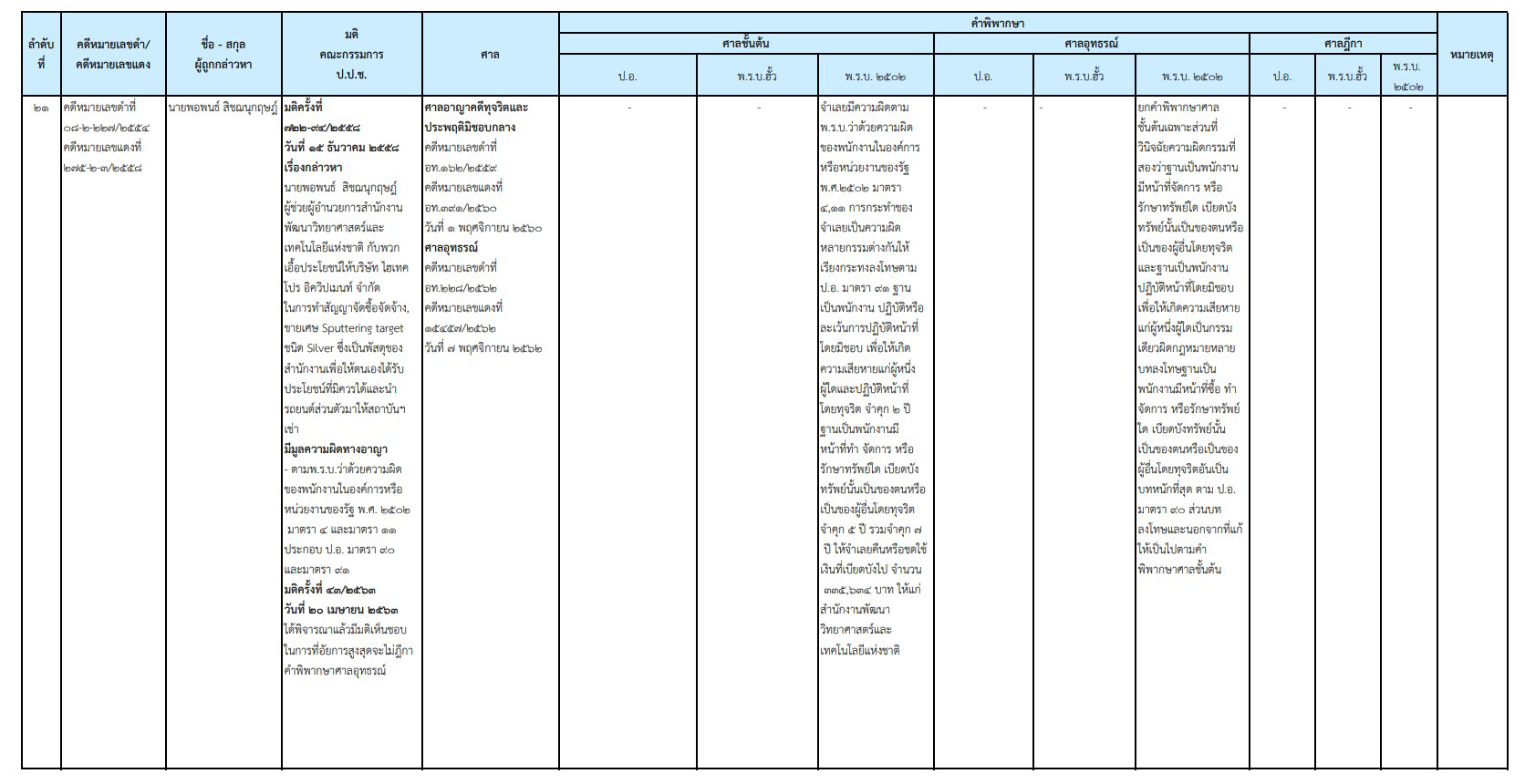 โดยความคืบคดีนี้ เมื่อวันที่ 1 พฤศจิกายน 2560 ศาลอาญาคดีทุจริตและประพฤติมิชอบกลาง มีคำพิพากษาว่า จำเลย มีความผิดตาม พ.ร.บ.ว่าด้วยความผิดของพนักงานในองค์การ หรือหน่วยงานของรัฐ พ.ศ. 2502 มาตรา 4 และมาตรา 11 การกระทำของจำเลยเป็นความผิดหลายกรรมต่างกันให้เรียงกระทงลงโทษตามประมวลกฎหมายอาญา มาตรา 91 ฐานเป็นพนักงานปฏิบัติหรือละเว้นการปฏิบัติหน้าที่โดยมิชอบ เพื่อให้เกิดความเสียหายแก่ผู้หนึ่งผู้ใดและปฏิบัติหน้าที่โดยทุจริต จำคุก 2 ปี ฐานเป็นพนักงานมีหน้าที่ทำ จัดการ หรือรักษาทรัพย์ใด เบียดบังทรัพย์นั้นเป็นของตนหรือเป็นของผู้อื่นโดยทุจริต จำคุก 5 ปี รวมจำคุก 7 ปี ให้จำเลยคืนหรือชดใช้เงินที่เบียดบังไป จำนวน 335,634 บาท ให้แก่สำนักงานพัฒนาวิทยาศาสตร์และเทคโนโลยีแห่งชาติ