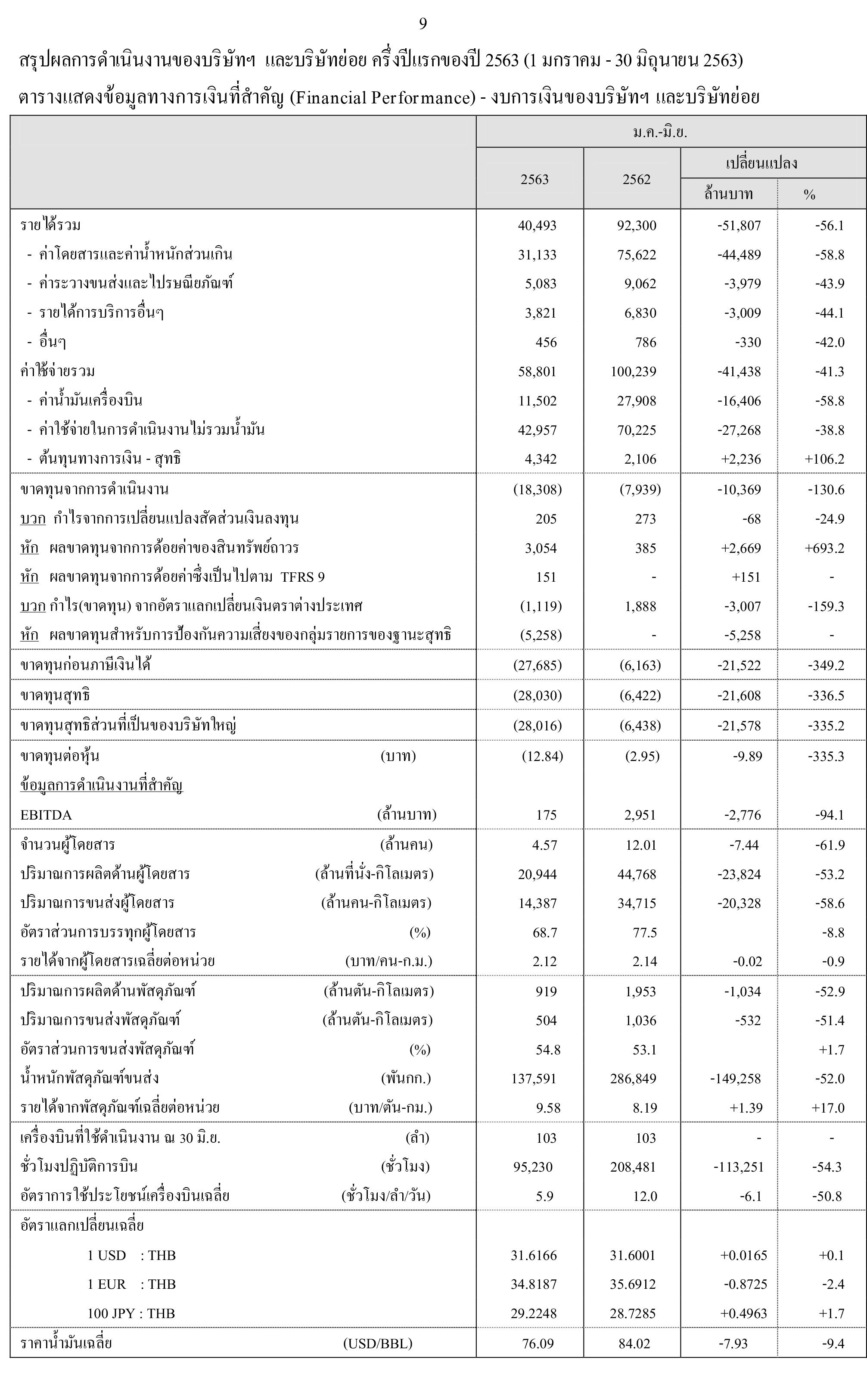 ทั้งนี้ ไตรมาส 1/63 บริษัทฯ มีผลขาดทุนสุทธิ 22,676 ล้านบาท เทียบกับช่วงเดียวกันปีก่อนที่มีกำไรสุทธิ 456 ล้านบาท และไตรมาส 2/63 บริษัทฯ มีผลขาดทุนสุทธิ 5,353 ล้านบาท เทียบกับช่วงเดียวกันปีก่อนที่ขาดทุนสุทธิ 6,878 ล้านบาท ขณะที่ ณ วันที่ 30 มิ.ย.2563 บริษัทฯ มีสินทรัพย์รวม 314,044 ล้านบาท มีหนี้สินรวม 332,199 ล้านบาท โดยมีส่วนของผู้ถือหุ้นติดลบ 18,155 ล้านบาท เทียบกับ ณ วันที่ 31 ธ.ค.62 ที่มีส่วนของผู้ถือหุ้น 29,921 ล้านบาท