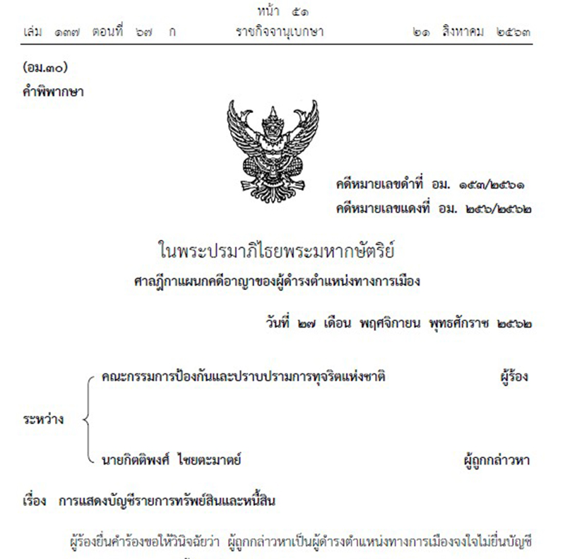 สำนักข่าวอิศรา www.isranews.org รายงานว่า วันที่ 21 ส.ค. 2563 ราชกิจจานุเบกษาเผยแพร่คำพิพากษาศาลฎีกา คดีการแสดงบัญชีรายการทรัพย์สินและหนี้สิน โดยคณะกรรมการป้องกันและปราบปรามการทุจริตแห่งชาติ (คณะกรรมการ ป.ป.ช.) ผู้ร้องรายนายกิตติพงศ์ ไชยตะมาตย์ รองนายกองค์การบริหารส่วนตำบล (อบต.) นาหัวบ่อ อ.พรรณานิคม จ.สกลนคร จงใจไม่ยื่นบัญชีแสดงรายการทรัพย์สินและหนี้สินและเอกสารประกอบต่อผู้ร้องภายในเวลาที่กฎหมายกำหนดและมีพฤติการณ์อันควรเชื่อได้ว่ามีเจตนาไม่แสดงที่มาแห่งทรัพย์สินหรือหนี้สินนั้น กรณีพ้นจากตำแหน่งและกรณีพ้นจากตำแหน่งมาแล้วเป็นเวลาหนึ่งปี พิพากษาว่า กรณีพ้นจากตำแหน่ง ขาดอายุความทางอาญา ส่วนกรณีไม่ยื่นทรัพย์สินกรณีพ้นจากตำแหน่ง หนึ่งปี พระราชบัญญัติประกอบรัฐธรรมนูญว่าด้วยการป้องกันและปราบปรามการทุจริต พ.ศ. 2561 ไม่ได้กำหนดให้ผู้บริหารท้องถิ่น รองผู้บริหารท้องถิ่น ผู้ช่วยผู้บริหารท้องถิ่น และสมาชิกสภาท้องถิ่นมีหน้าที่ยื่นบัญชีแสดงรายการทรัพย์สินและหนี้สินและเอกสารประกอบต่อผู้ร้องกรณีพ้นจากตำแหน่งมาแล้วเป็นเวลาหนึ่งปี จึงเป็นกรณีที่บทบัญญัติของกฎหมายที่บัญญัติในภายหลัง บัญญัติว่าการกระทำเช่นนั้นไม่เป็นความผิดอีกต่อไป พิพากษายกคำร้อง รายละเอียดดังนี้