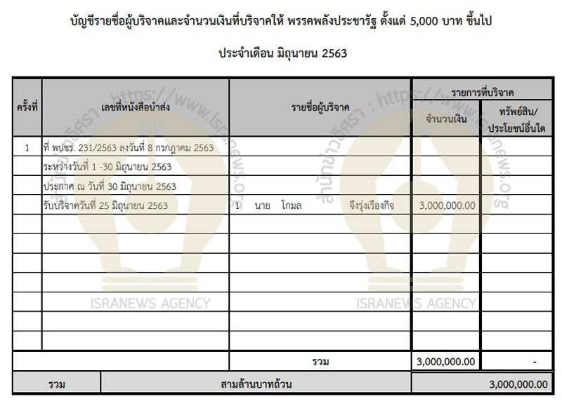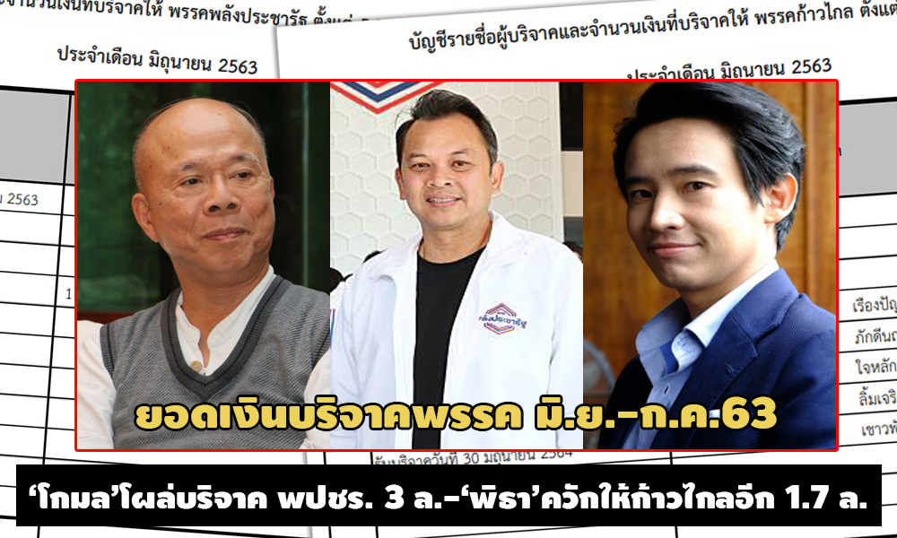 เผยยอดเงินบริจาคพรรคการเมือง มิ.ย.-ก.ค.63 ‘โกมล จึงรุ่งเรืองกิจ’โผล่บริจาค พปชร. 3 ล้าน ‘ตั๊น-ณัฏฐพล’ 1 ล้าน กลุ่มเอกชนอื้อ ‘พิธา’บริจาครอบสองให้ก้าวไกล 1.7 ล้านเศษ พรรคกล้าประเดิมผู้บริจาค 7.6 แสน