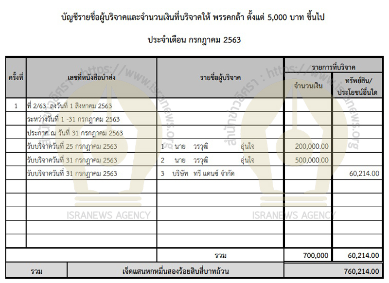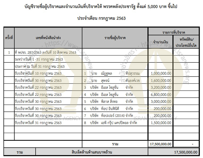 สำนักข่าวอิศรา (www.isranews.org) รายงานว่า เมื่อเร็ว ๆ นี้ สำนักงานคณะกรรมการการเลือกตั้ง (กกต.) เผยแพร่บัญชีรายชื่อผู้บริจาคและจำนวนเงินที่บริจาคให้แก่พรรคการเมือง ประจำเดือน มิ.ย. และ ก.ค. 2563 โดยมีพรรคที่น่าสนใจ เช่น พรรคพลังประชารัฐ (พปชร.) พรรคก้าวไกล (กก.) และพรรคกล้า เป็นต้น