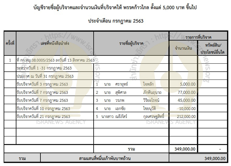 ส่วนยอดในเดือน ก.ค. 2563 รวม 349,000 บาท มีผู้บริจาค 5 ราย ได้แก่ นายศรายุทธ์ ใจหลัก อดีตผู้อำนวยการพรรคอนาคตใหม่ 5,000 บาท นายสุพิศาล ภักดีนฤนาถ ส.ส. 77,000 บาท นายวรภพ วิริยะโรจน์ ส.ส. 45,000 บาท นายเอกชัย ไชยนุวัติ นักวิชาการชื่อดัง 10,000 บาท และ น.ส.ณธีภัสร์ กุลเศรษฐสิทธิ์ ส.ส. 212,000 บาท