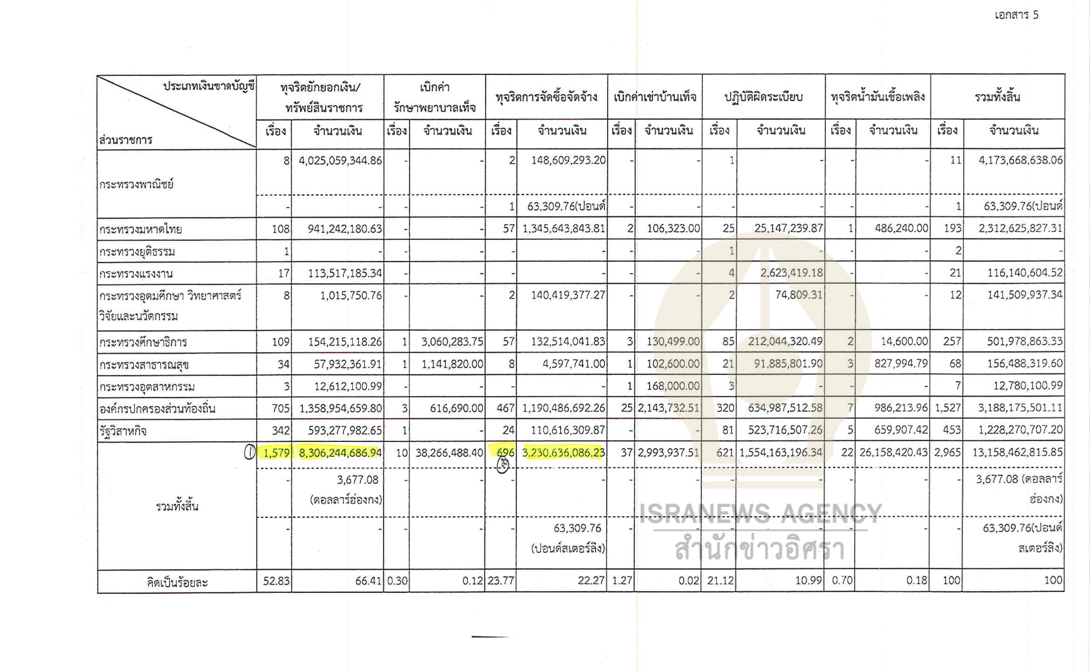 อนึ่งก่อนหน้านี้ สำนักข่าวอิศรา รายงานไปแล้วว่า ณ วันที่ 30 กันยายน 2562 มีเรื่องที่อยู่ระหว่างดำเนินการกรณีเงินขาดบัญชีหรือเจ้าหน้าที่ของรัฐทุจริตจำแนกตามส่วนราชการ / การบริหารราชการแผ่นดิน จำนวน 22 แห่ง จำนวนเรื่อง 2,965 เรื่อง รวมวงเงินทั้งสิ้น 13,158,462,815.85 บาท