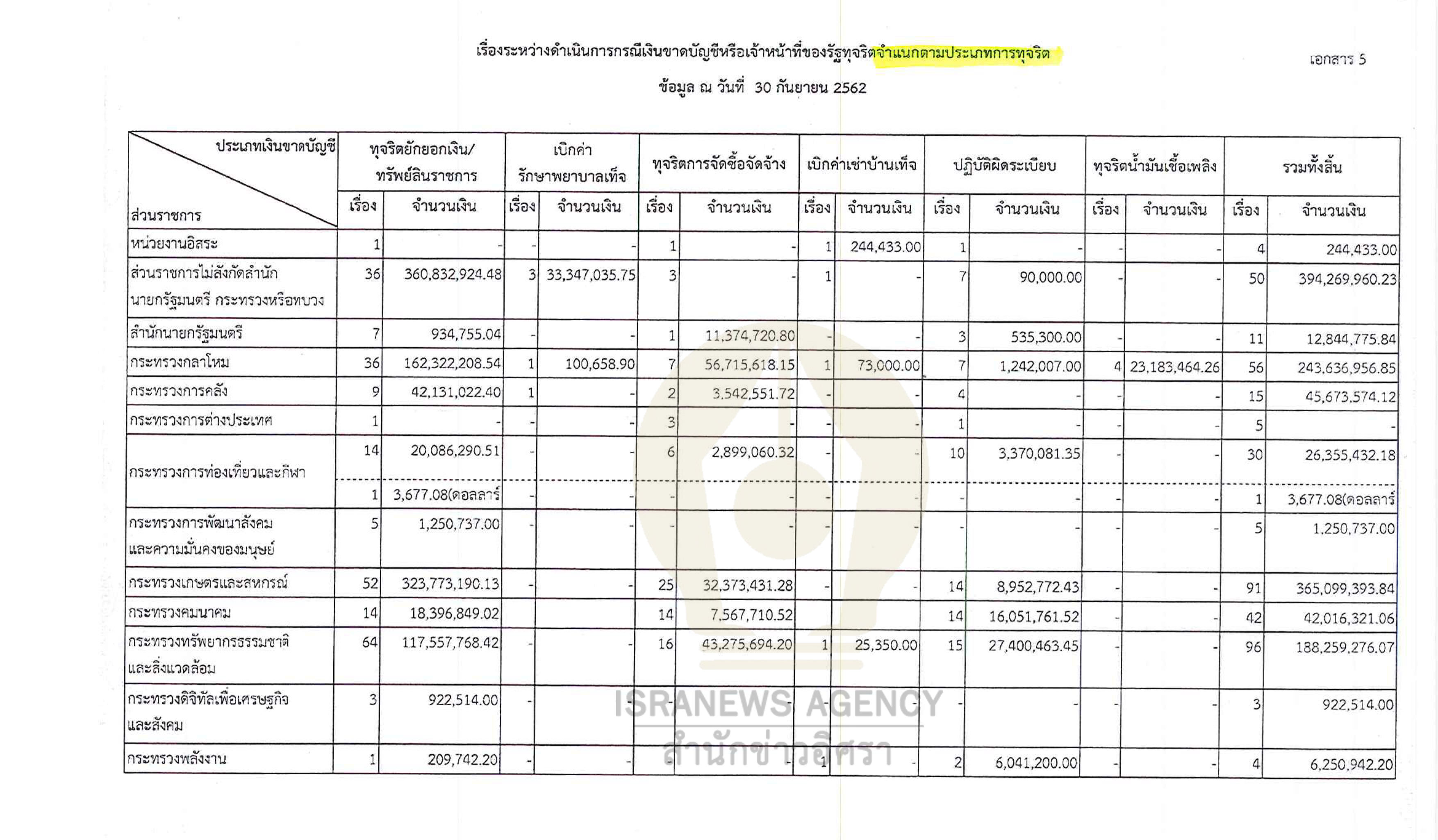 จากกรณีสำนักข่าวอิศรา (www.isranews.org) ตรวจสอบพบว่า ในช่วงปลายปี 2562 ที่ผ่านมา สำนักงานปลัดนายกรัฐมนตรี ได้จัดทำรายงานผลการเร่งรัดติดตามกรณีเงินขาดบัญชีหรือเจ้าหน้าที่รัฐทุจริต (หนี้ค้างเก่า) ประจำปีงบประมาณ พ.ศ.2562 รอบ 6 เดือนหลัง คือ 1 เม.ย.2562 -30 ก.ย.2562 เพื่อเร่งรัดติดตามหน่วยงานของรัฐที่เกิดกรณีเงินขาดบัญชีหรือเจ้าหน้าที่ของรัฐทุจริต ให้ดำเนินการทั้งทางแพ่ง ทางอาญาและทางวินัย กับผู้กระทำความผิดและผู้ที่เกี่ยวข้อง นำเสนอให้ พล.อ.ประยุทธ์ จันทร์โอชา นายกรัฐมนตรี รับทราบ และเห็นชอบให้แจ้งผลการเร่งรัดให้หัวหน้าส่วนราชการที่เกี่ยวข้องได้รับทราบต่อไป โดยพบว่า ณ วันที่ 30 กันยายน 2562 มีเรื่องที่อยู่ระหว่างดำเนินการกรณีเงินขาดบัญชีหรือเจ้าหน้าที่ของรัฐทุจริตจำแนกตามส่วนราชการ / การบริหารราชการแผ่นดิน จำนวน 22 แห่ง จำนวนเรื่อง 2,965 เรื่อง รวมวงเงินทั้งสิ้น 13,158,462,815.85 บาท