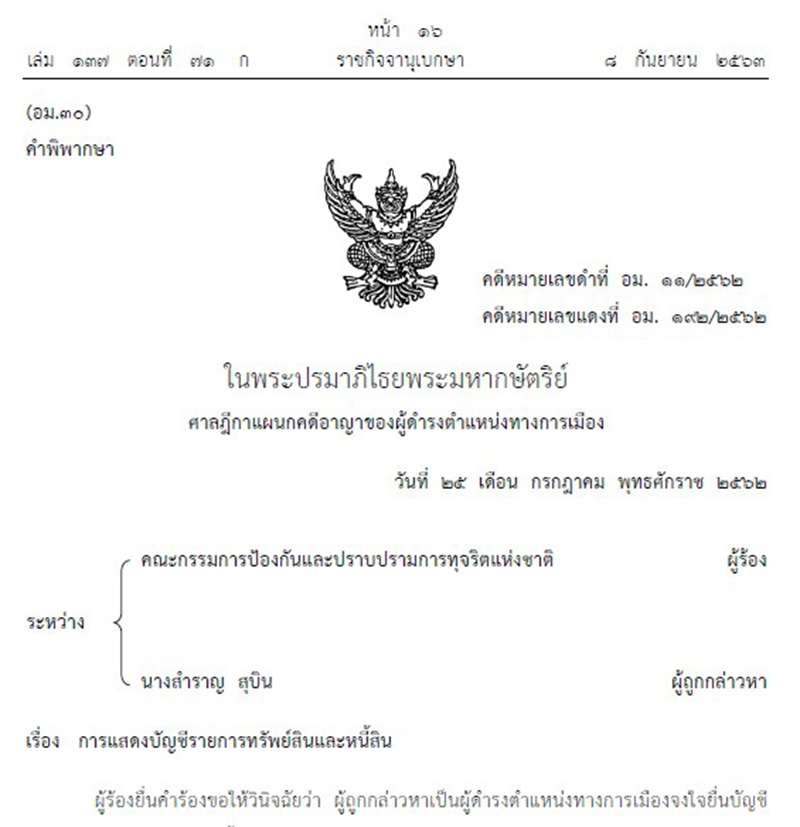 สำนักข่าวอิศรา www.isranews.org : 8 ก.ย. 2563 ราชกิจจานุเบกษา เผยแพร่คำพิพากษา ศาลฎีกาแผนกคดีอาญาของผู้ดำรงตำแหน่งทางการเมือง คดีการแสดงบัญชีรายการทรัพย์สินและหนี้สิน รายนางสำราญ สุบิน รองนายกองค์การบริหารส่วนตำบล (อบต.) ป่ามะม่วง อำเภอเมืองตาก จังหวัดตาก จงใจยื่นบัญชีแสดงรายการทรัพย์สินและหนี้สินและเอกสารประกอบต่อผู้ร้องด้วยข้อความอันเป็นเท็จหรือปกปิดข้อเท็จจริงที่ควรแจ้งให้ทราบ และมีพฤติการณ์อันควรเชื่อได้ว่ามีเจตนาไม่แสดงที่มาแห่งทรัพย์สินหรือหนี้สินนั้นกรณีเข้ารับตำแหน่งให้ผู้ถูกกล่าวหาพ้นจากตำแหน่งรองนายกองค์การบริหารส่วนตำบลป่ามะม่วงที่ดำรงอยู่ในปัจจุบัน นับแต่วันที่ 21 พฤษภาคม 2562 และห้ามมิให้ผู้ถูกกล่าวหาดำรงตำแหน่งทางการเมืองหรือดำรงตำแหน่งใดในพรรคการเมืองเป็นเวลาห้าปี นับแต่วันที่ 25 กรกฎาคม จำคุก 6 เดือน และปรับ 10,000 บาท โทษจำคุกจึงให้รอการลงโทษไว้มีกำหนด 1 ปี รายละเอียดดังนี้