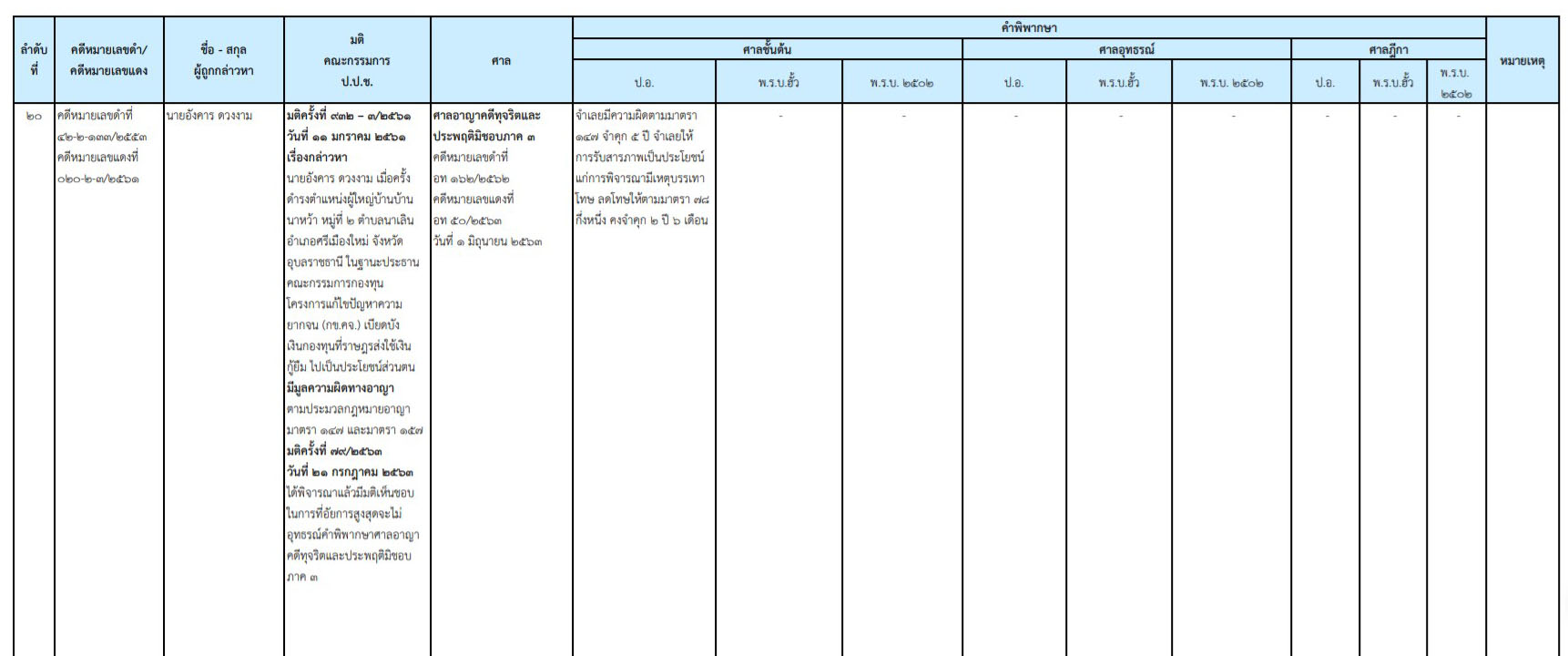 ป.ป.ช. เผยแพร่ความคืบหน้าคดีกล่าวหา 'อังคาร ดวงงาม' อดีตผู้ใหญ่บ้านนาหว้า หมู่ที่ 2 ตำบลนาเลิน อำเภอศรีเมืองใหม่ จังหวัดอุบลราชธานี ปธ.คกก.กองทุนโครงการแก้ไขปัญหาความยากจน เบียดบังเงินไปเป็นประโยชน์ส่วนตน ล่าสุด ศาลอาญาคดีทุจริตและประพฤติมิชอบภาค 3 พิพากษาลงโทษจำคุก 5 ปี รับสารภาพลดเหลือ 2 ปี 6 เดือน