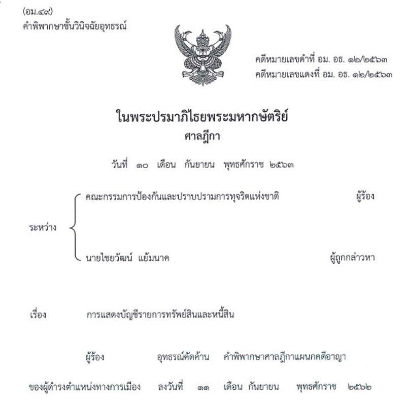 สำนักข่าวอิศรา (www.isranews.org) รายงานว่า เมื่อวันที่ 10 ก.ย. 2563 ศาลฎีกา มีคำพิพากษาในชั้นวินิจฉัยอุทธรณ์ คดีการแสดงบัญชีรายการทรัพย์สินและหนี้สิน ระหว่าง คณะกรรมการป้องกันและปราบปรามการทุจริตแห่งชาติ (คณะกรรมการ ป.ป.ช.) ผู้ร้อง นายไชยวัฒน์ แย้มนาค สมาชิกสภาองค์การบริหารส่วนจังหวัดนนทบุรี (ส.อบจ.นนทบุรี) ผู้ถูกกล่าวหา ผู้ร้องคัดค้านคำพิพากษาของศาลฎีกาแผนกคดีอาญาของผู้ดำรงตำแหน่งทางการเมือง ที่ยกคำร้อง คดีจงใจยื่นบัญชีแสดงรายการทรัพย์สินและหนี้สินและเอกสารประกอบต่อผู้ร้องด้วยข้อความอันเป็นเท็จหรือปกปิดข้อเท็จจริงที่ควรแจ้งให้ทราบ และมีพฤติการณ์อันควรเชื่อได้ว่ามีเจตนาไม่แสดงที่มาแห่ง ทรัพย์สินและหนี้สิน จำนวน 4 ครั้ง คดีขาดอายุความ 5 ปี ส่วนกรณี ยื่นบัญชีฯเท็จ กรณีพ้นจากตำแหน่งมาแล้วเป็นเวลาหนึ่งปีในการดำรงตำแหน่ง วาระที่ 1 นั้น กฎหมาย ป.ป.ช.ฉบับใหม่มิได้กำหนดให้ต้องยื่น ถือว่าไม่เป็นความผิด (อ่านข่าวเกี่ยวข้อง: ศาลฎีกาฯ ยกคำร้อง ส.อบจ. นนทบุรี เขตบางบัวทอง ยื่นบัญชีเท็จ ป.ป.ช. ขาดอายุความ)