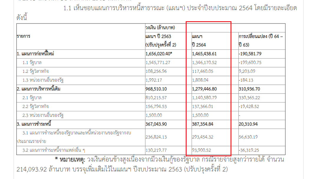 สำนักข่าวอิศรา (www.isranews.org) รายงานว่า เมื่อวันที่ 29 ก.ย. ที่ประชุมคณะรัฐมนตรี (ครม.) ที่มีพล.อ.ประยุทธ์ จันทร์โอชา นายกรัฐมนตรี และรมว.กลาโหม เป็นประธาน มีมติรับทราบและอนุมัติแผนการบริหารหนี้สาธารณะประจำปีงบประมาณ 2564 ตามที่นายสันติ พร้อมพัฒน์ รมช.คลัง รักษาราชการแทนรมว.คลัง ประธานกรรมการนโยบายและกำกับการบริหารหนี้สาธารณะ เสนอ ซึ่งประกอบด้วย แผนการก่อหนี้ใหม่ 1,465,438.61 ล้านบาท แผนการบริหารหนี้เดิม 1,279,446.80 ล้านบาท และแผนการชำระหนี้ 387,354.84 ล้านบาท