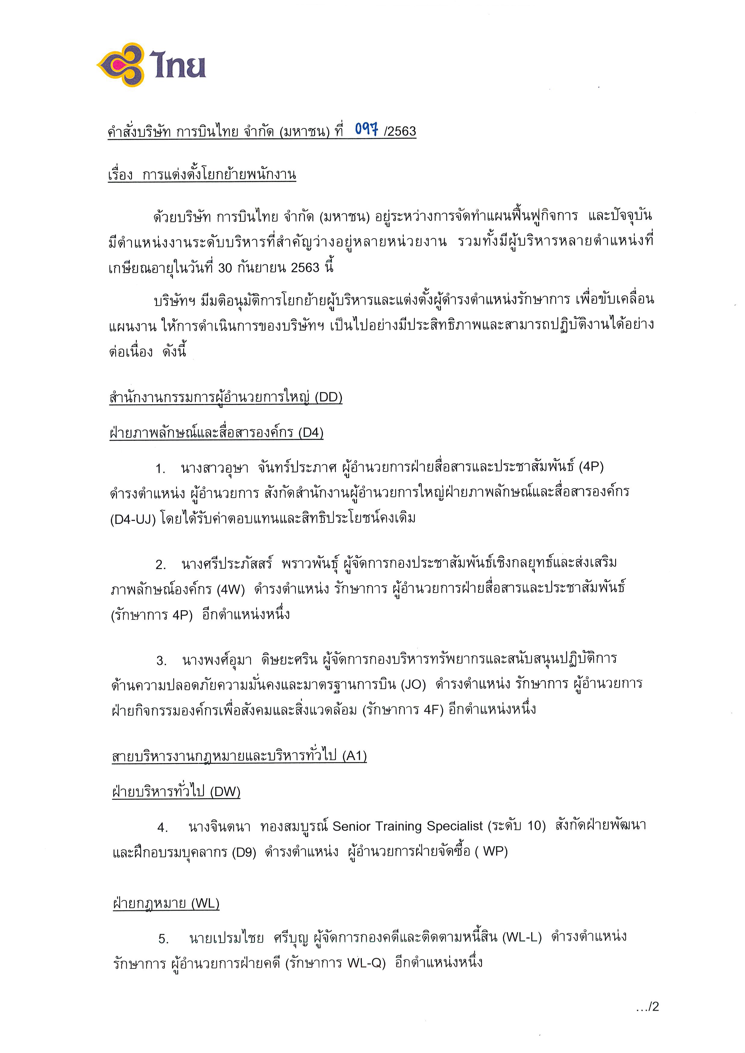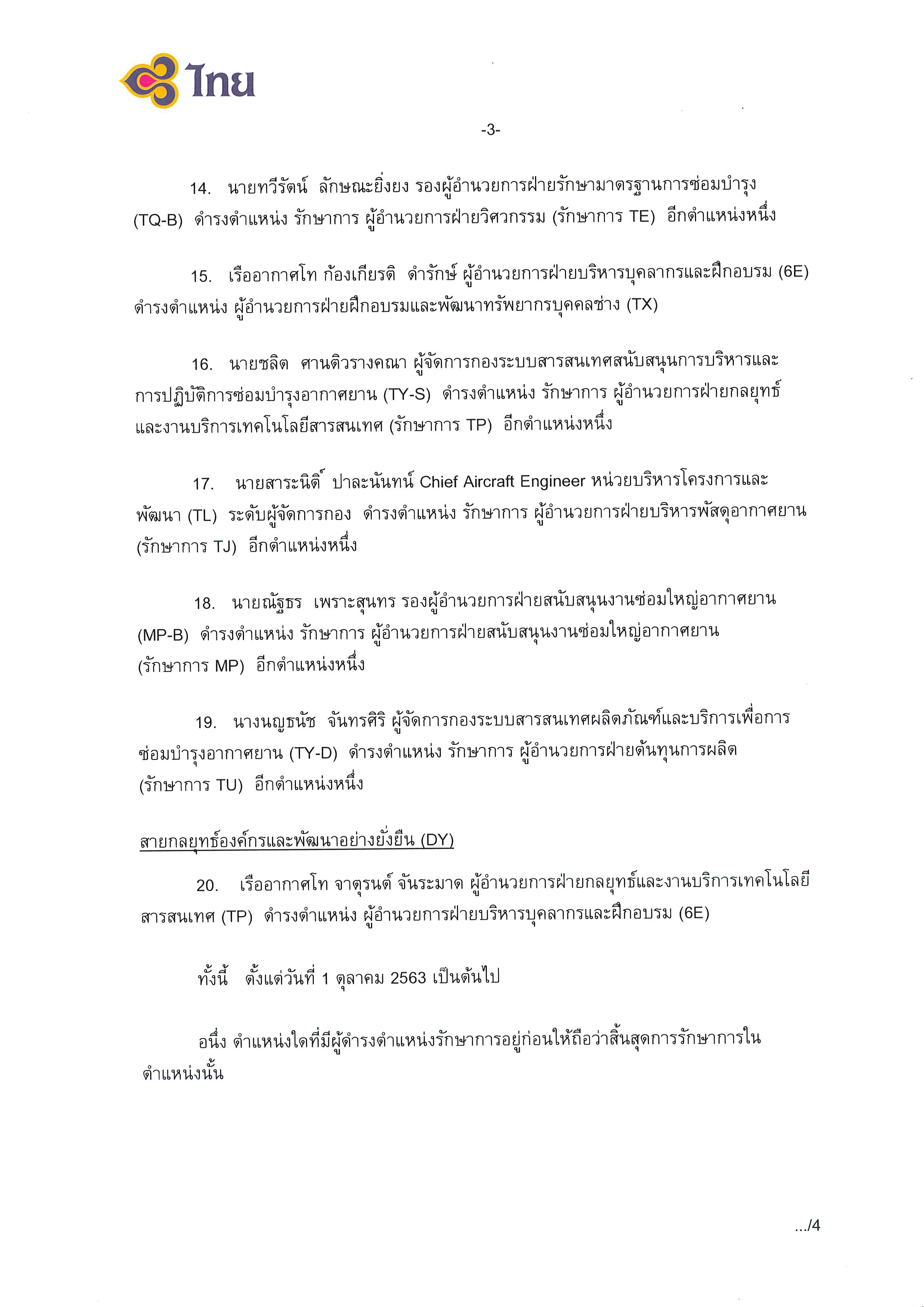 สำนักข่าวอิศรา (www.isranews.org) รายงานว่า เมื่อวันที่ 1 ต.ค.ที่ผ่านมา นายชาญศิลป์ ตรีนุชกร กรรมการบริษัทฯ และรักษาการแทนกรรมการผู้อำนวยการใหญ่ บริษัท การบินไทย จำกัด (มหาชน) ลงนามคำสั่งบริษัท การบินไทย จำกัด (มหาชน) ที่ 097/2563 เรื่อง การแต่งตั้งโยกย้ายพนักงาน รวมทั้งสิ้น 20 ตำแหน่ง เพื่อทดแทนตำแหน่งงานที่ว่างลง และตำแหน่งที่เกษียณอายุในวันที่ 30 ก.ย.2563