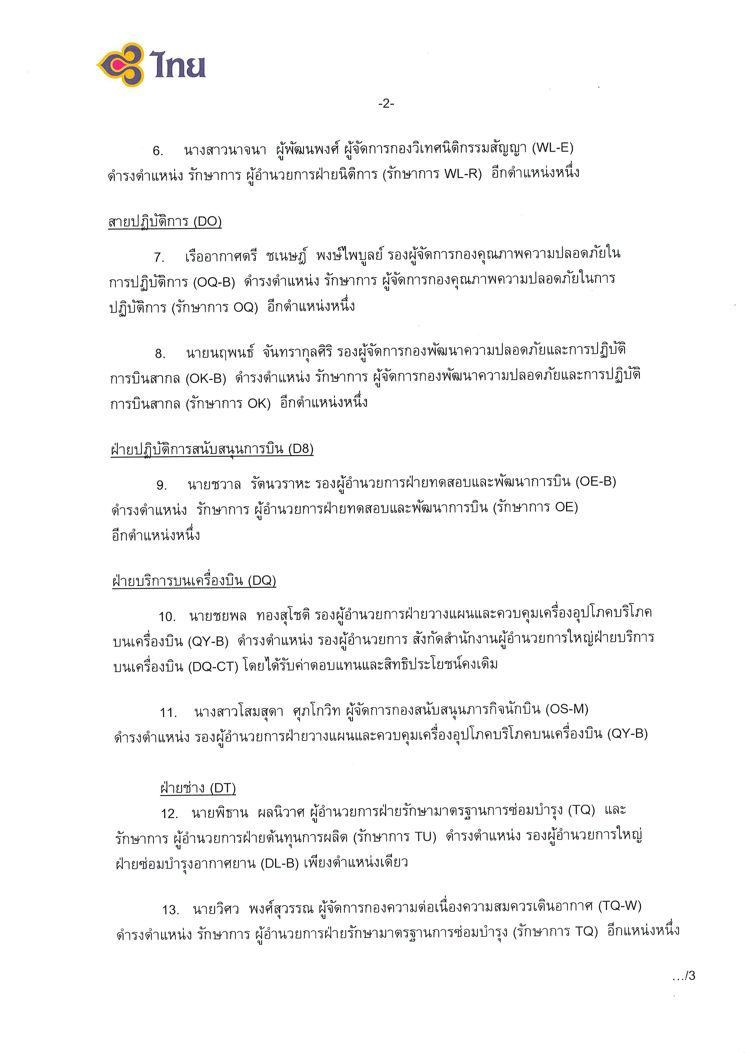 10.นายชยพล ทองสุโชติ รองผู้อำนวยการฝ่ายวางแผนและควบคุมเครื่องอุปโภคบริโภคบนเครื่องบิน (QY-B) ดำรงตำแหน่ง รองผู้อำนวยการ สังกัดสำนักงานผู้อำนวยการใหญ่ฝ่ายบริการบนเครื่องบิน (DQ-CT) โดยได้รับค่าตอบแทนและสิทธิประโยชน์คงเดิม