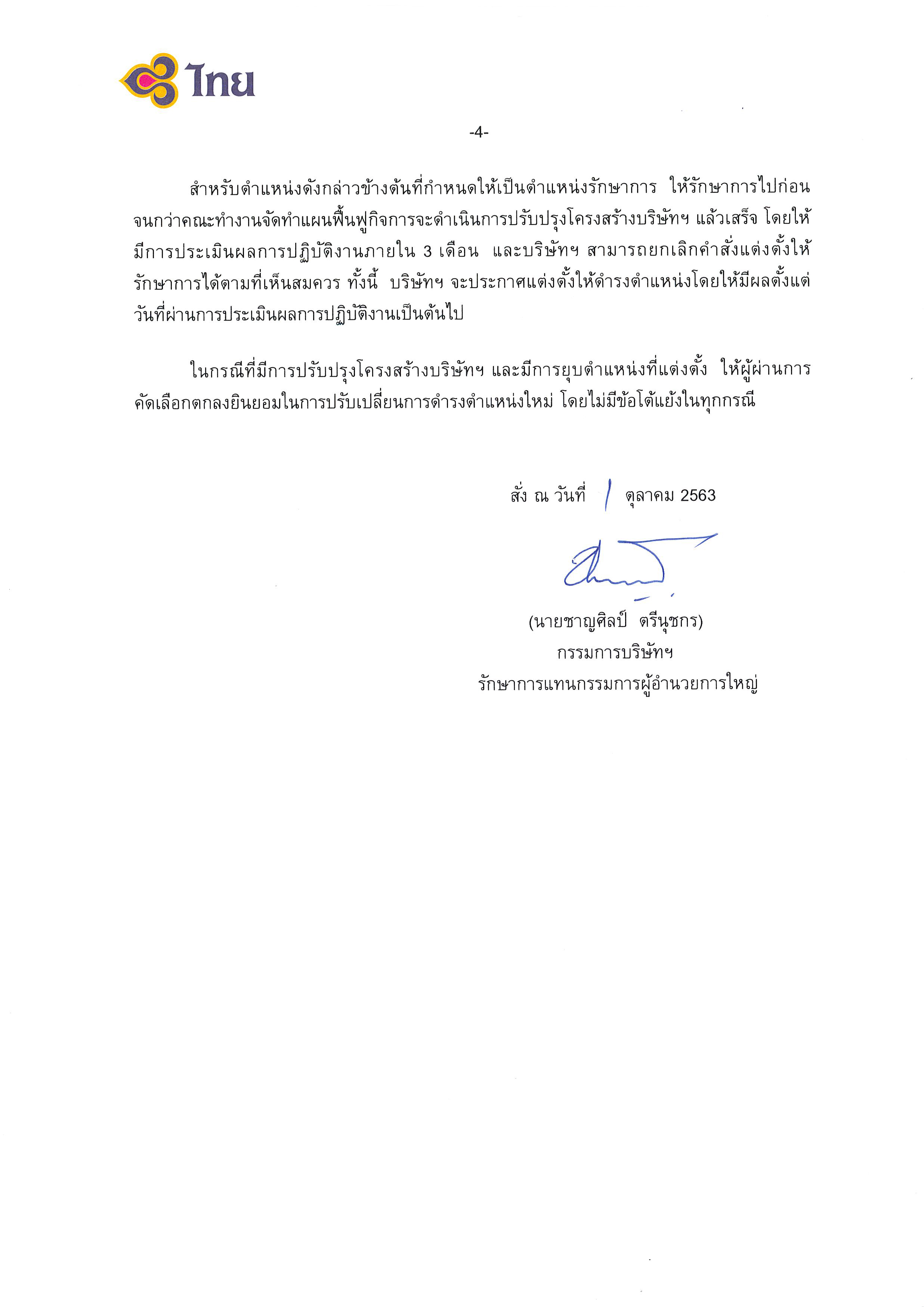 สำหรับตำแหน่งดังกล่าวข้างต้นที่กำหนดให้เป็นตำแหน่งรักษาการ ให้รักษาการไปก่อน จนกว่าคณะทำงานจัดทำแผนฟื้นฟูกิจการจะดำเนินการปรับปรุงโครงสร้างบริษัทฯแล้วเสร็จ โดยให้มีการประเมินผลการปฏิบัติงานภายใน 3 เดือน และบริษัทฯ สามารถยกเลิกคำสั่งแต่งตั้งให้รักษาการได้คมที่เห็นสมควร ทั้งนี้ บริษัทฯ จะประกาศแต่งตั้งให้ดำรงตำแหน่งโดยให้มีผลตั้งแต่วันที่ผ่านการประเมินผลการปฏิบัติงานเป็นต้นไป