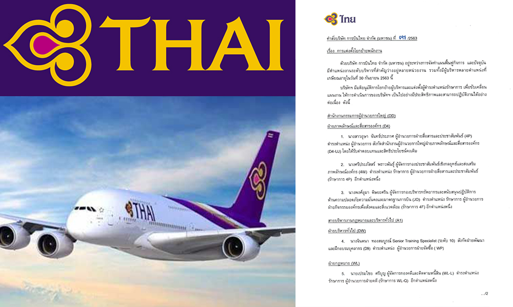 ‘การบินไทย’ โยกย้ายพนักงานระดับบริหารล็อตใหญ่ 20 ตำแหน่ง ทดแทนตำแหน่ง ‘ว่าง-เกษียณอายุ’ เผยแต่งตั้ง ‘พงศ์อุมา ดิษยะศริน’ นั่งรักษาการ ผอ.ฝ่ายกิจการฯอีกตำแหน่ง