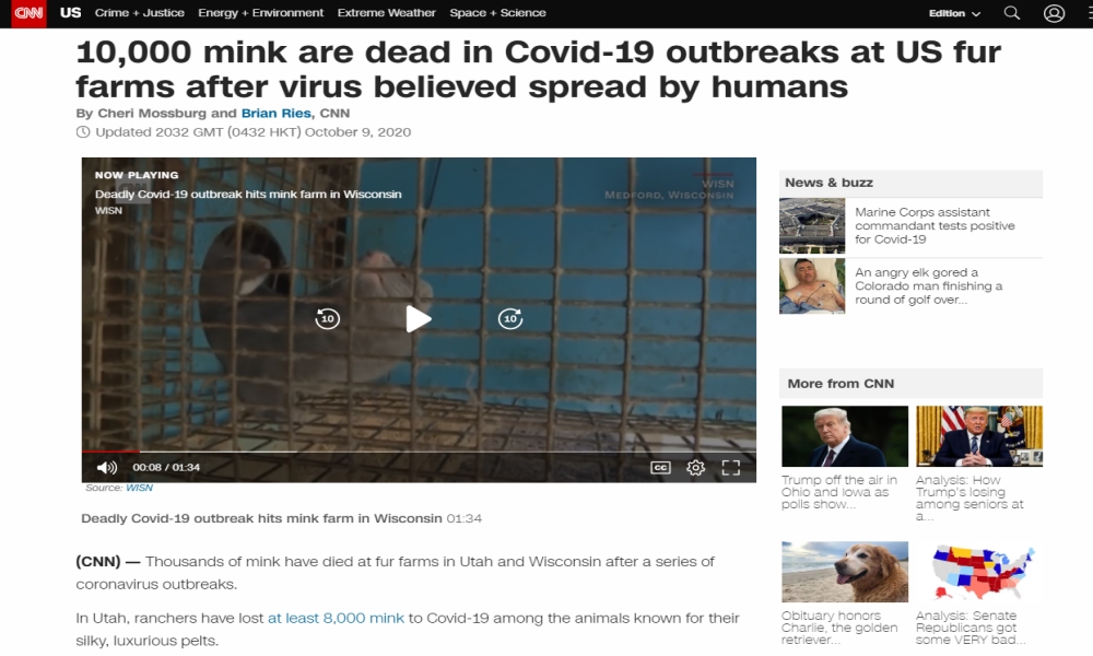 ส่วนความเคลื่อนไหวอื่นๆในสหรัฐฯ ล่าสุดมีรายงานว่ามีตัวมิงค์จำนวน 8,000-10,000 ตัว ซึ่งอยู่ในฟาร์มรัฐยูทาห์จำนวน 9 แห่ง ตายจากอาการติดเชื้อไวรัสโควิด-19 ในช่วงเวลา 10 วันที่ผ่านมา โดยเชื้อไวรัสโควิด 19 เริ่มที่จะระบาดในหมู่สัตว์ในฟาร์มของสหรัฐฯเมื่อช่วงต้นเดือน ส.ค. ที่ผ่านมา ซึ่งก่อนที่จะมีการระบาดในตัวมิงค์ พบว่ามีคนงานในฟาร์มจำนวนหนึ่งติดเชื้อไวรัสโควิด-19