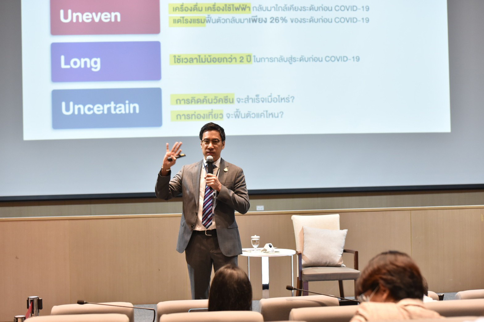 อย่างไรก็ตาม หลังจากผ่อนคลายมาตรการล็อกดาวน์ หรือเมื่อผู้ป่วยออกมาพักฟื้นจากไอซียูแล้ว บริบทประเทศได้เปลี่ยนไปอย่างน้อย 3 ด้าน คือ 1.การฟื้นตัวของกิจกรรมทางเศรษฐกิจแตกต่างกันมาก (Uneven) ทั้งในมิติของสาขาเศรษฐกิจ มิติเชิงพื้นที่ และขนาดของธุรกิจ 2.การฟื้นตัวของเศรษฐกิจคาดว่าจะใช้เวลานาน (Long) ไม่น้อยกว่า 2 ปี ในการกลับสู่ระดับก่อนโควิด ส่วนหนึ่งเพราะโครงสร้างสินค้าและตลาดส่งออกของไทยกระจุกอยู่ในกลุ่มสินค้าและตลาดที่ฟื้นตัวช้า