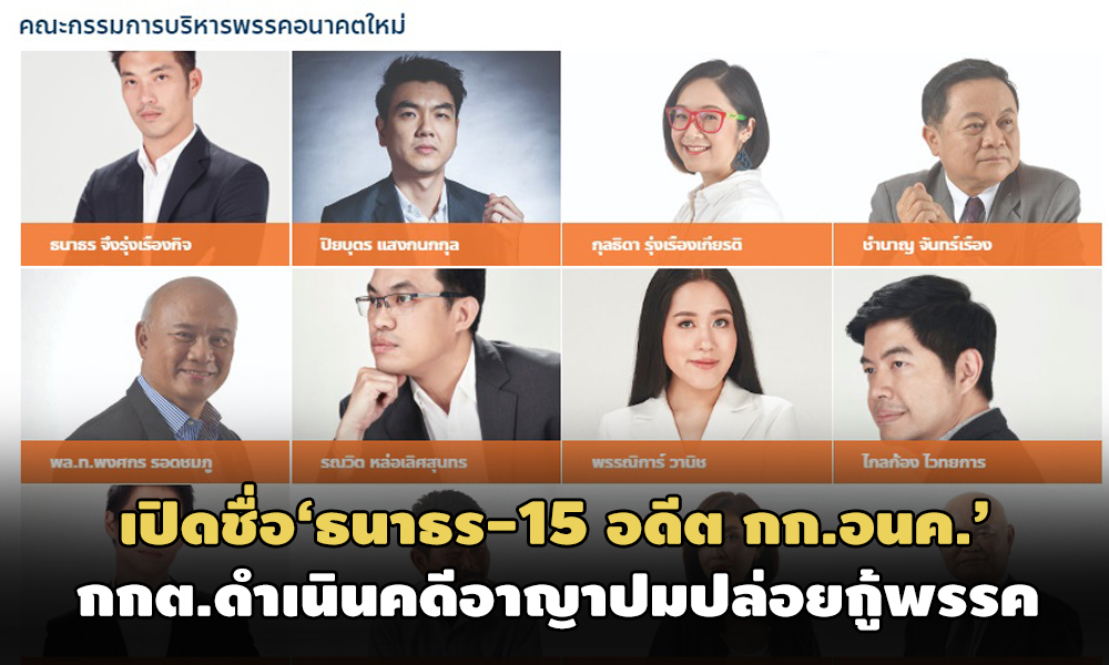 ผู้สื่อข่าวรายงานว่าสำหรับรายชื่ออดีตกรรมการบริหารพรรคอนาคตใหม่ 15 ราย ที่ถูกดำเนินคดีพร้อมกับนายธนาธร ได้แก่ 1.นายปิยบุตร แสงกนกกุล อดีตเลขาธิการพรรค น.ส.กุลธิดา จึงรุ่งเรืองเกียรติ นายชำนาญ จันทร์เรือง พล.ท.พงศกร รอดชมภู นายรณวิต หล่อเลิศสุนทร น.ส.พรรณิการ์ วานิช อดีตโฆษกพรรค นายไกลก้อง ไวทยการ นายนิติพัฒน์ แต้มไพโรจน์ อดีตนายทะเบียนพรรค นายสุนทร บุญยอด นางเยาวลักษณ์ วงษ์ประภารัตน์ นายสุรชัย ศรีสารคาม นายเจนวิทย์ ไกรสินธุ์ นายชัน ภักดีศรี น.ส.จารุวรรณ ศรัณย์เกตุ และนายนิรามาน สุไลมาน
