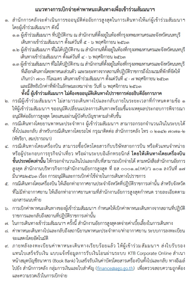 กรณีนี้ อสส. อนุมัติการเบิกค่าใช้จ่ายในการเดินทางไปข้าราชการ ของอัยการที่จะเข้าร่วมงานสัมมนาครั้งนี้ โดยสำนักการคลังจะดำเนินการขออนุมัติต่อ อสส. ในการเดินทางให้แก่ผู้เข้าร่วมการสัมมนา โดยผู้เข้าร่วมการสัมมนาไม่ต้องขออนุมัติเดินทางไปราชการต่ออธิบดีอัยการภาค