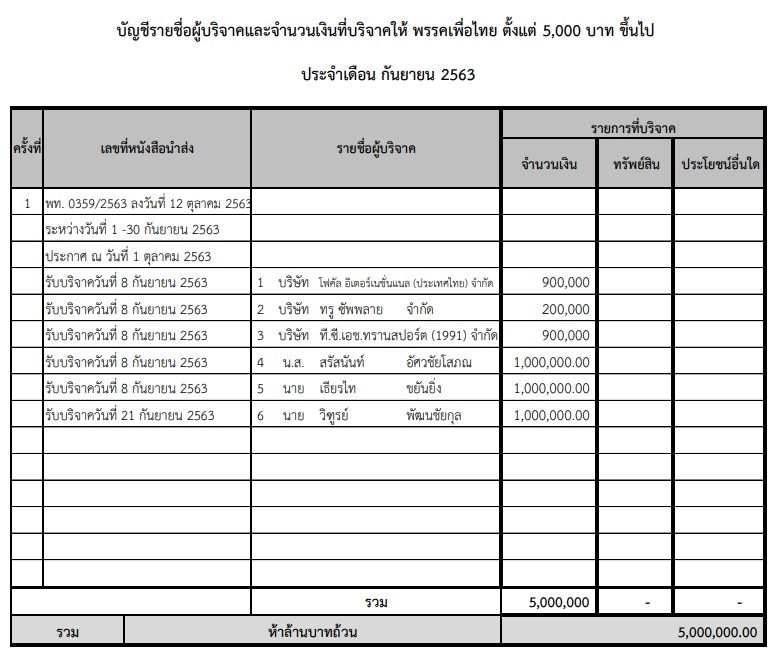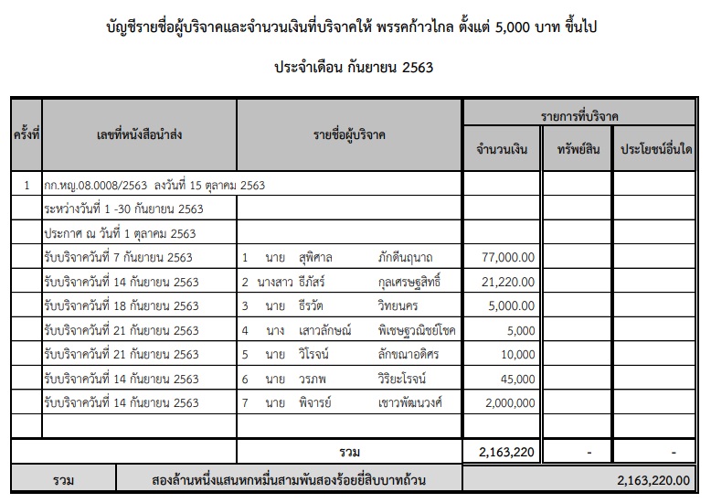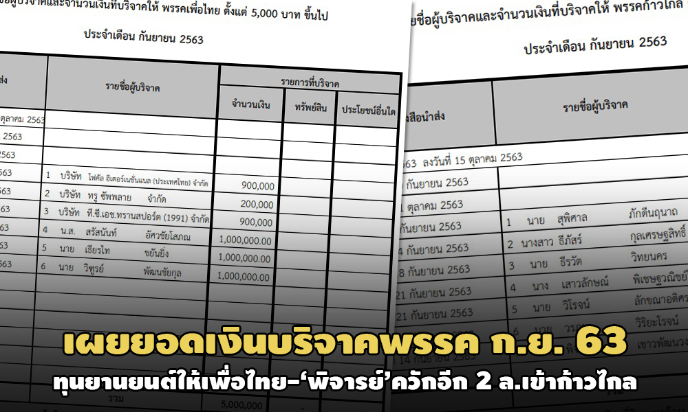 เผยยอดเงินบริจาคพรรคการเมือง ก.ย. 63 นักธุรกิจ-กลุ่มทุนยานยนต์ จ.เลย บริจาคเข้า ‘เพื่อไทย’ 1 ล้าน-เครือญาติ ‘เฮียเน้า’ มาด้วยควัก 1 ล้าน – ‘พิจารย์’ บริจาคให้ ‘ก้าวไกล’ อีก 2 ล้าน ยอดรวมพุ่ง 6.4 ล้าน – ‘วรวีร์ มะกูดี’ บริจาคทรัพย์สินให้ ‘ประชาชาติ’ ด้วย 2.4 แสน