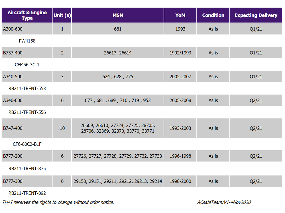สำนักข่าวอิศรา (www.isranews.org) รายงานว่า เมื่อวันที่ 5 พ.ย. เว็บไซต์ www.thaiaircrafttrading.com ของบริษัท การบินไทย จำกัด (มหาชน) ประกาศขายเครื่องบินของบริษัท การบินไทย จำนวน 7 รุ่น พร้อมเครื่องยนต์ รวมทั้งสิ้น 34 ลำ โดยผู้สนใจสอบถามรายละเอียด และยื่นความสนใจเข้าร่วมการซื้อเครื่องบินดังกล่าวเข้ามาได้ที่อีเมล์ [email protected] ถึงวันที่ 13 พ.ย.2563