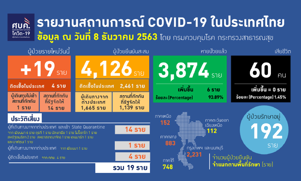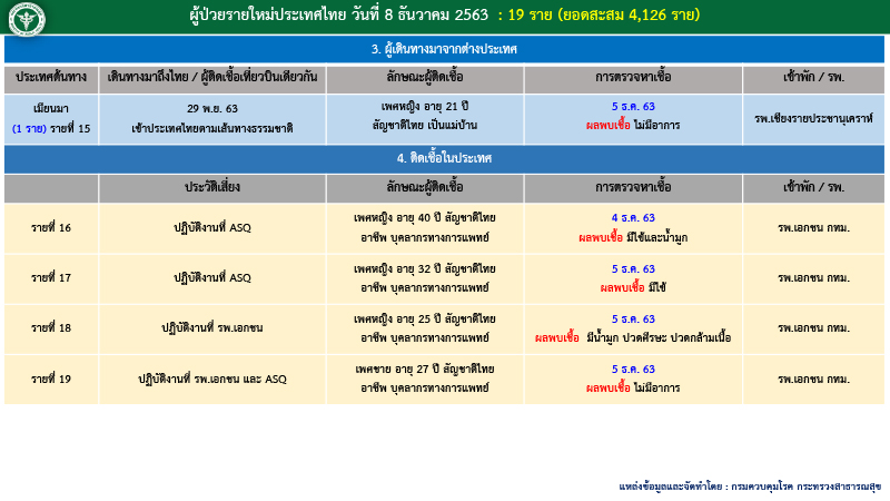 สำนักข่าวอิศรา (www.isranews.org) รายงานว่า เมื่อวันที่ 8 ธ.ค.2563 ศูนย์บริหารสถานการณ์โควิด (ศบค.) รายงานสถานการณ์ประจำวัน พบผู้ป่วยรายใหม่ 19 ราย เป็นผู้ติดเชื้อในประเทศ 4 ราย เป็นบุคลากรทางการแพทย์อายุตั้งแต่ 25-40 ปี พบเชื้อในโรงแรงมแห่งหนึ่งใน กทม.ซึ่งถูกใช้เป็น Alternative State Quarantine (ASQ)