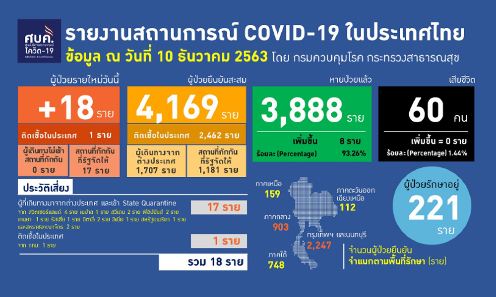 สำนักข่าวอิศรา (www.isranews.org) รายงานว่า เมื่อวันที่ 10 ธ.ค.2563 ศูนย์บริหารสถานการณ์โควิด (ศบค.) รายงานสถานการณ์ประจำวัน พบผู้ป่วยรายใหม่ 18 ราย แบ่งเป็น ผู้ติดเชื้อในประเทศ 1 ราย เป็นบุคลากรทางการแพทย์ อายุ 29 ปี กลุ่มเดียวกันกับผู้ป่วยที่พบก่อนหน้านี้ ส่วนผู้ป่วยรายใหม่อีก 17 รายกลับจากต่างประเทศ ประกอบด้วย สวิตเซอร์แลนด์ 4 ราย เนปาล 1 ราย สวีเดน 2 ราย ฟิลิปปินส์ 2 ราย เคนยา 1 ราย รัสเซีย 1 ราย อิตาลี 2 ราย ลิเบีย 1 ราย สหรัฐอเมริกา 1 ราย และสหราชอาณาจักร 1 ราย รวมผู้ป่วยยืนยันสะสม 4,169 ราย หายป่วยเพิ่ม 8 ราย อยู่ระหว่างรักษาตัวในโรงพยาบาล 221 ราย และเสียชีวิตคงเดิม 60 ราย
