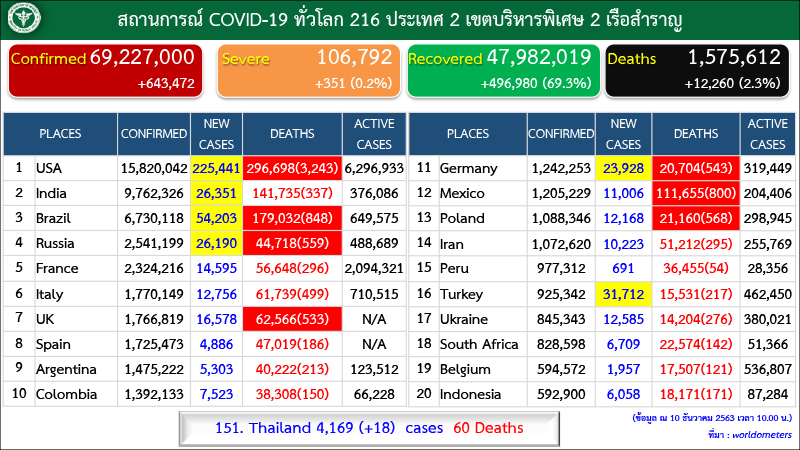 ขณะที่สถานการณ์ทั่วโลกพบผู้ป่วยเพิ่ม 643,472 ราย รวม 69,227,000 ราย หายป่วย 47,982,019 ราย เสียชีวิต 1,575,612 ราย โดยสหรัฐอเมริกาพบผู้ป่วยเพิ่ม 225,441 ราย รวม 15,820,042 ราย เสียชีวิตเพิ่ม 3,243 ราย รวม 296,698 ราย อินเดีย พบเพิ่ม 26,351 ราย รวม 9,762,326 ราย เสียชีวิตเพิ่ม 337 ราย รวม 141,735 ราย บราซิล พบเพิ่ม 54,203 ราย รวม 6,730,118 ราย เสียชีวิตเพิ่ม 848 ราย รวม 179,032 ราย ขณะที่เมียนมา พบเพิ่ม 1,427 ราย รวม 103,166 ราย เสียชีวิตเพิ่ม 23 ราย รวม 2,174 ราย ส่วนไทยอยู่ในอันดับที่ 151 ของโลก