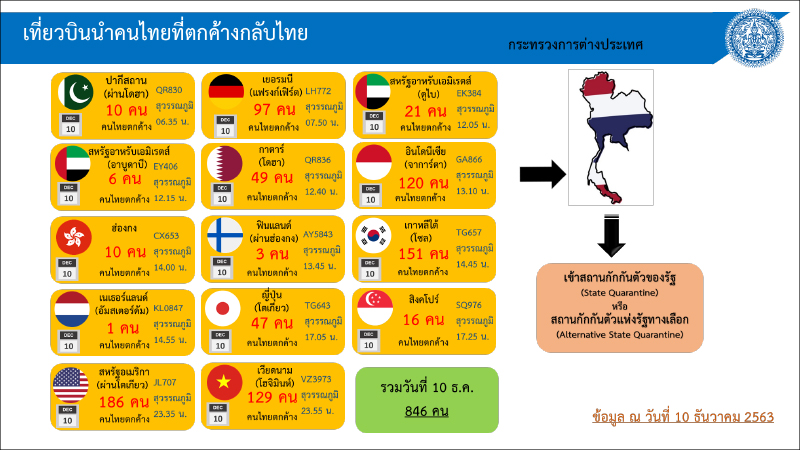 ส่วนกระทรวงการต่างประเทศรายงานว่า วันนี้จะมีคนเดินทางกลับเข้าไทยอีก 609 ราย 14 เที่ยวบิน ประกอบด้วย ปากีสถาน 10 ราย เยอรมนี 97 ราย สหรัฐอาหรับเอมิเรตส์ 2 เที่ยวบิน 27 ราย กาตาร์ 49 ราย อินโดนีเซีย 120 ราย ฮ่องกง 10 ราย ฟินแลนด์ 3 ราย เกาหลีใต้ 151 ราย เนเธอร์แลนด์ 1 ราย ญี่ปุ่น 47 ราย สิงคโปร์ 16 ราย สหรัฐอเมริกา 186 ราย และเวียดนาม 129 ราย โดยทั้งหมดต้องเข้ารับการกักตัวในสถานที่ที่รัฐจัดให้ เพื่อเฝ้าดูอาการ 14 วัน