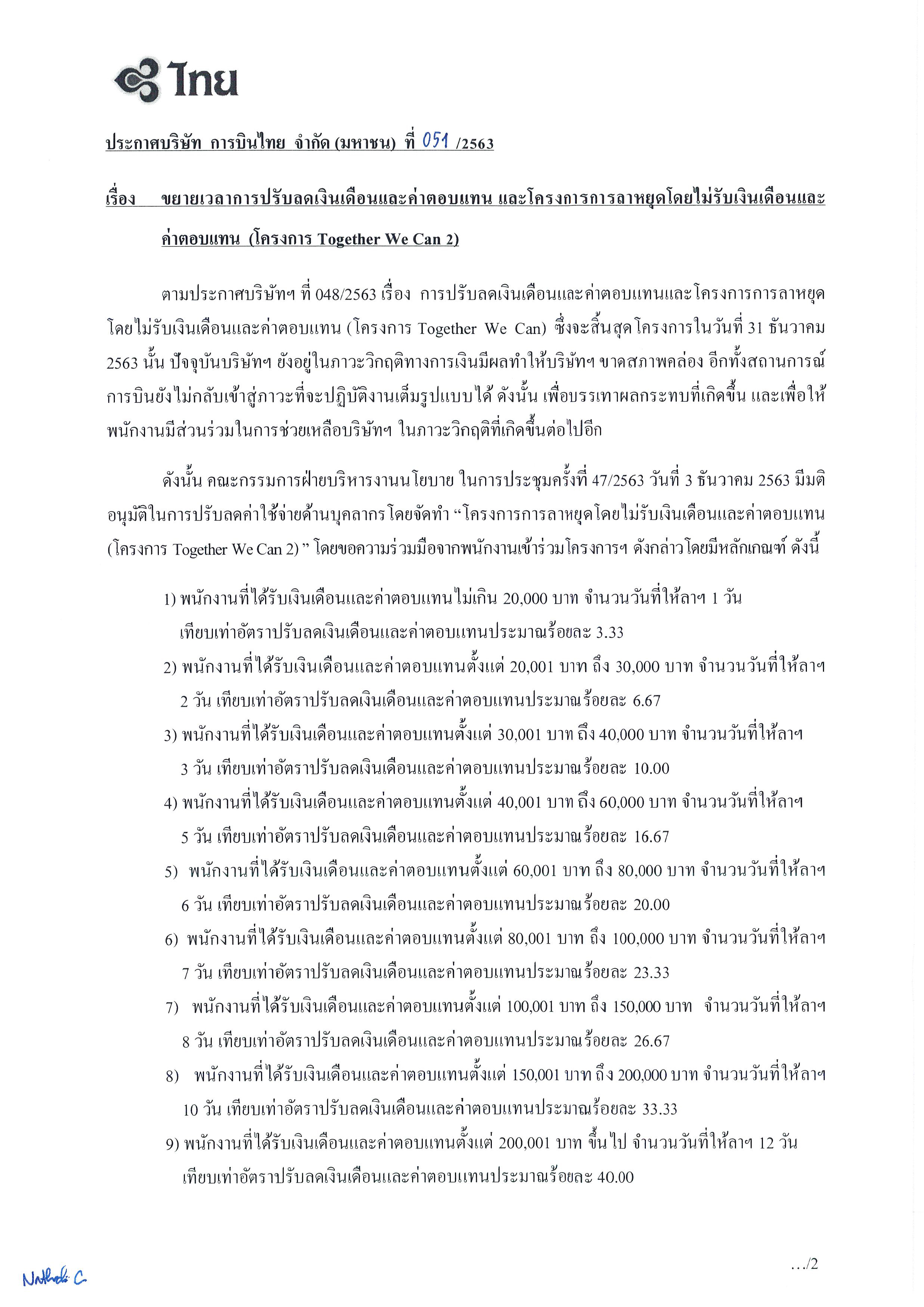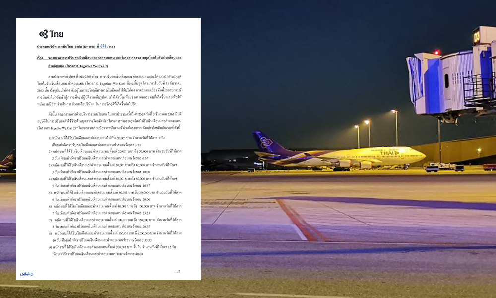 สำนักข่าวอิศรา (www.isranews.org) รายงานว่า เมื่อวันที่ 15 ธ.ค.ที่ผ่านมา นายชาญศิลป์ ตรีนุชกร รักษาการแทนกรรมการผู้อำนวยการใหญ่ บริษัท การบินไทย จำกัด (มหาชน) ลงนามประกาศบริษัท การบินไทย ที่ 051/2563 เรื่อง การขยายการปรับลดเงินเดือนและค่าตอบแทน และโครงการลาหยุดโดยไม่รับเงินเดือนและค่าตอบแทน (โครงการ Together We Can 2) เนื่องจากปัจจุบันบริษัทฯยังอยู่ในภาวะวิกฤตทางการเงิน ซึ่งมีผลทำให้บริษัทฯขาดสภาพคล่อง