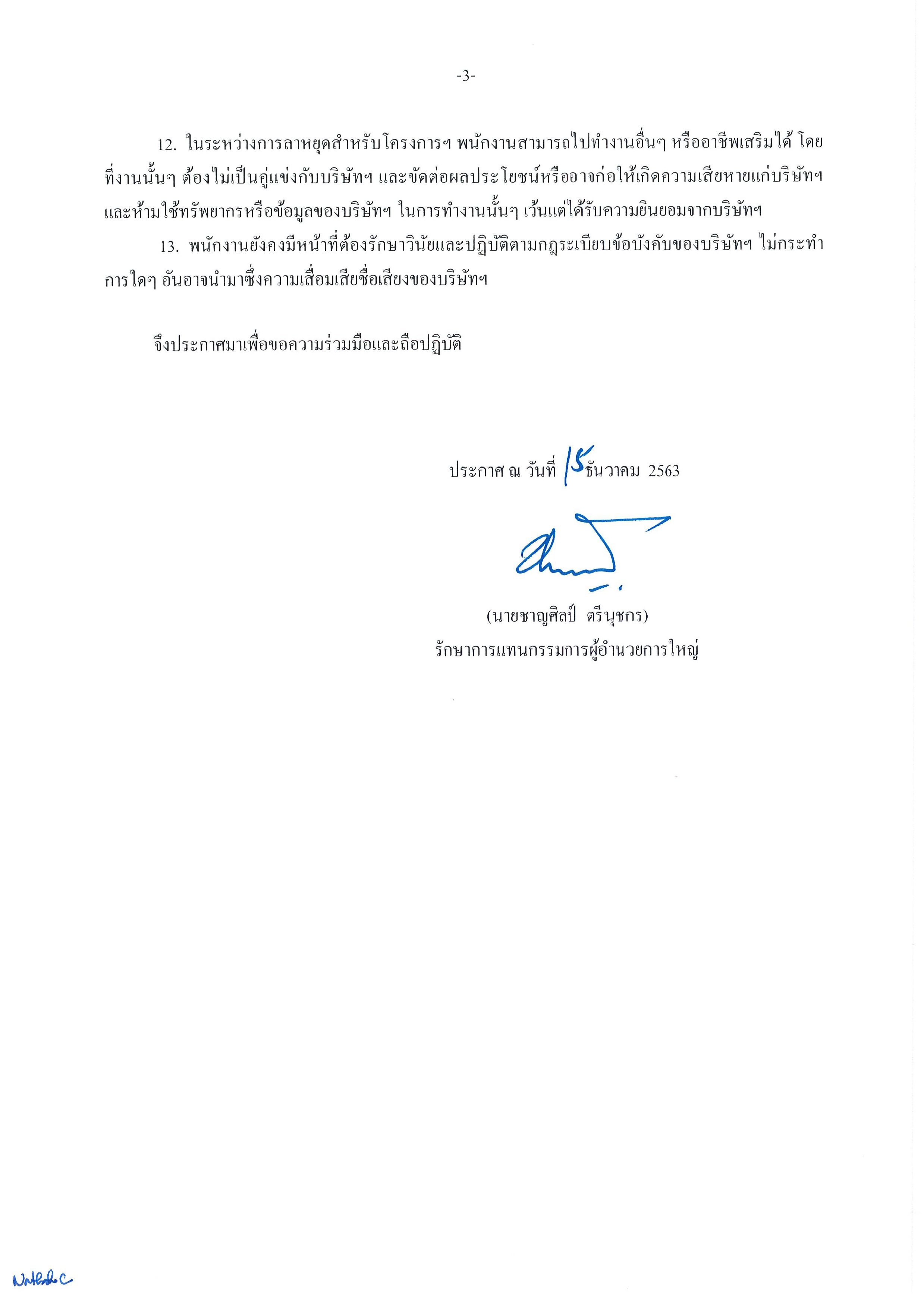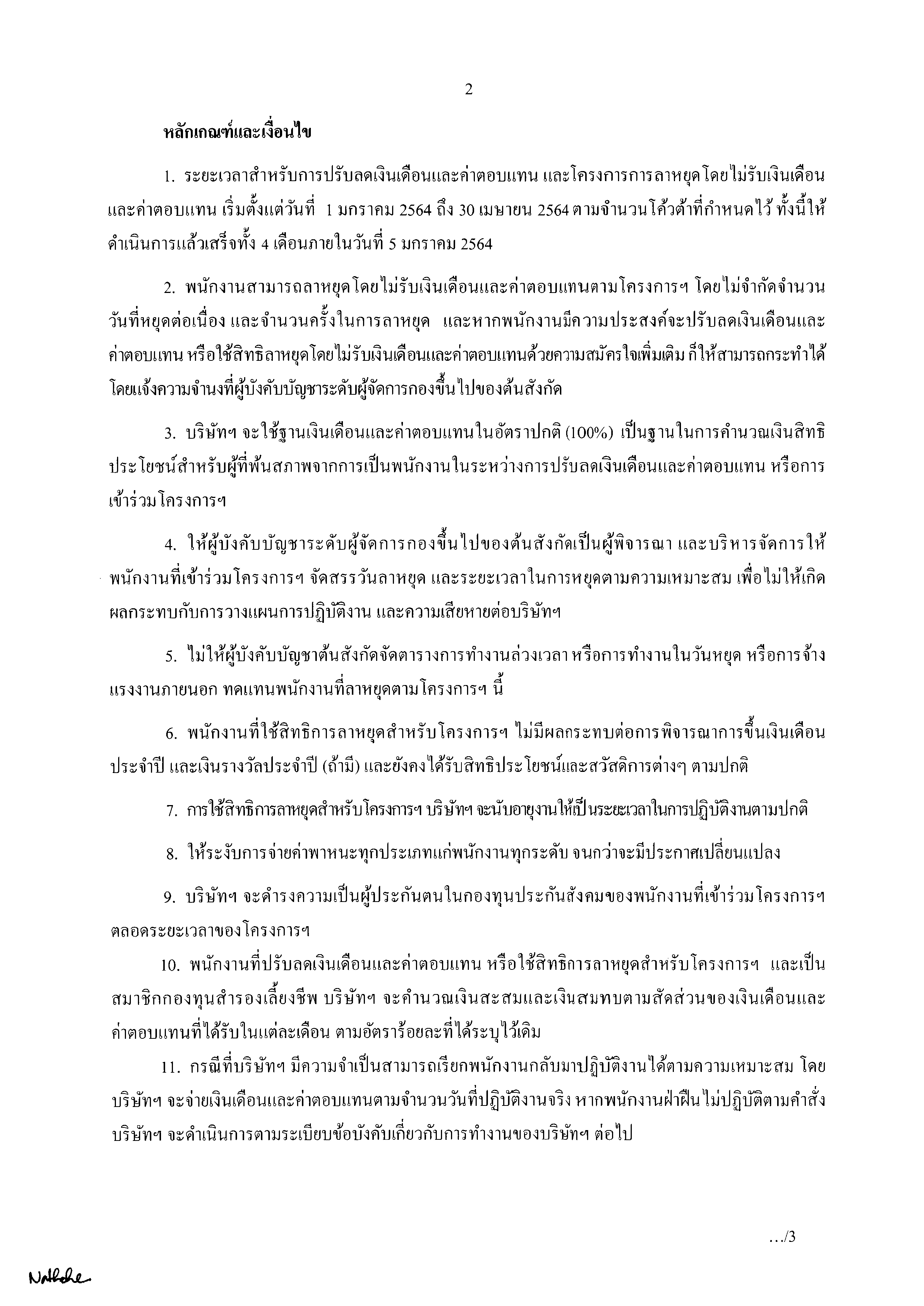 1.พนักงานที่ได้รับเงินเดือนและค่าตอบแทนไม่เกิน 20,000 บาท จำนวนวันที่ให้ลาฯ 1 วัน เทียบเท่าอัตราปรับลดเงินเดือนและค่าตอบแทนประมาณร้อยละ 3.33