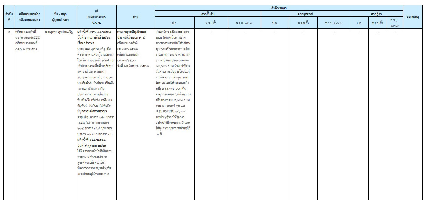 ป.ป.ช.เผยความคืบหน้าคดีกล่าวหา 'สุรพล สุขประเสริฐ' อดีต ผอ.รร.ค่ายประจักษ์ศิลปาคม รับรองผลงานทางวิชาการเป็นเท็จ ก่อนตั้งตนเองเป็นปธ.สอบช่วยเหลือให้พ้นผิด ล่าสุด ศาลอาญาคดีทุจริตและประพฤติมิชอบภาค 4 มีคำพิพากษาจำคุก 3 กระทง 18 เดือน ปรับ 15,000 บาท แต่โทษจำคุกให้รอการลงโทษไว้มีกำหนด 2 ปี คุมความประพฤติอีก 1 ปี