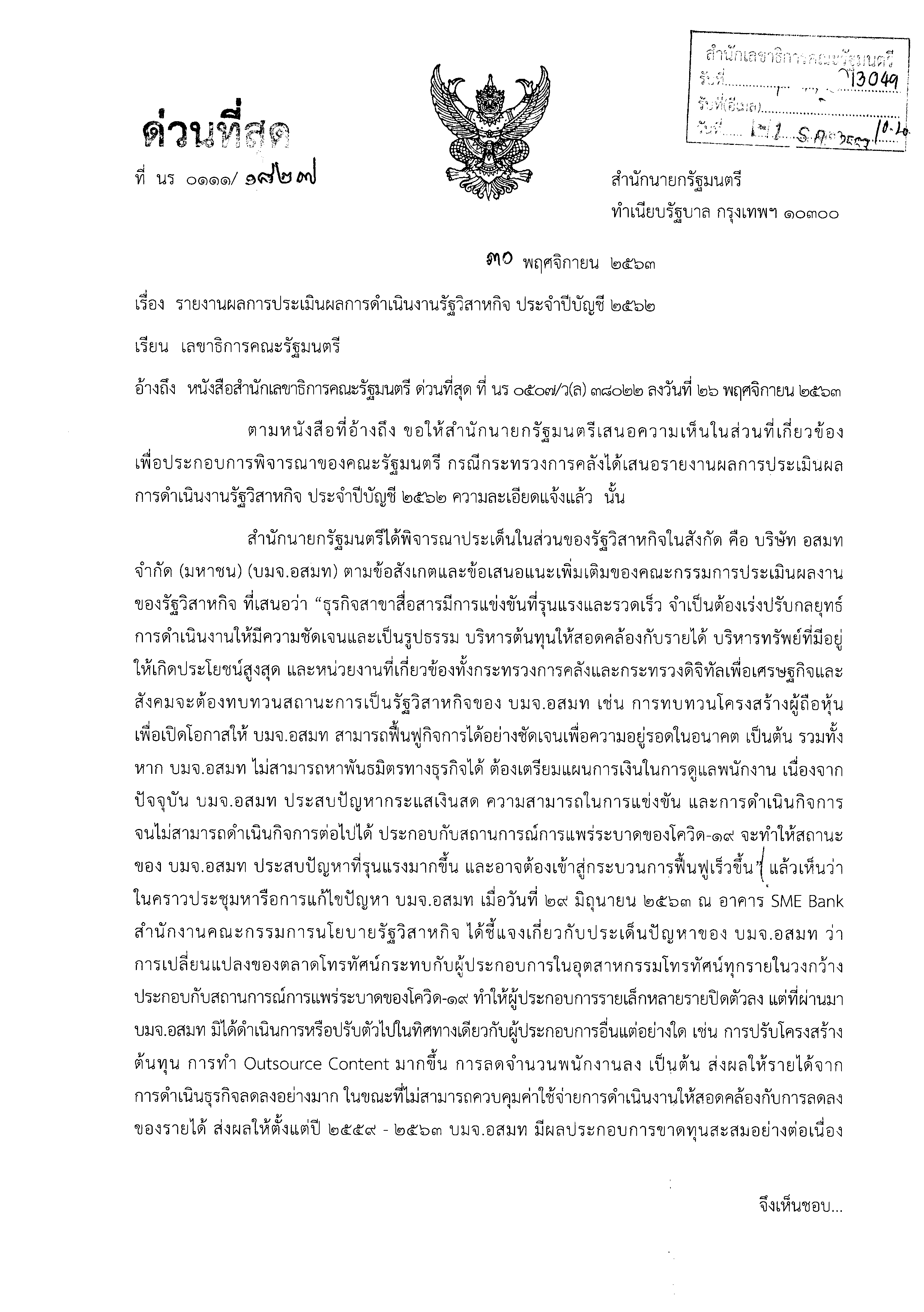 สำนักนายกฯหนุน ‘คณะกรรมการประเมินฯ’ หลังเสนอทบทวนโครงสร้างผู้ถือหุ้น ‘อสมท’ เปิดทางฟื้นฟูกิจการเพื่อความอยู่รอดในอนาคต ชี้ผลกระทบ ‘โควิด’ อาจทำให้บริษัทฯเข้าสู่กระบวนการฟื้นฟูเร็วขึ้น