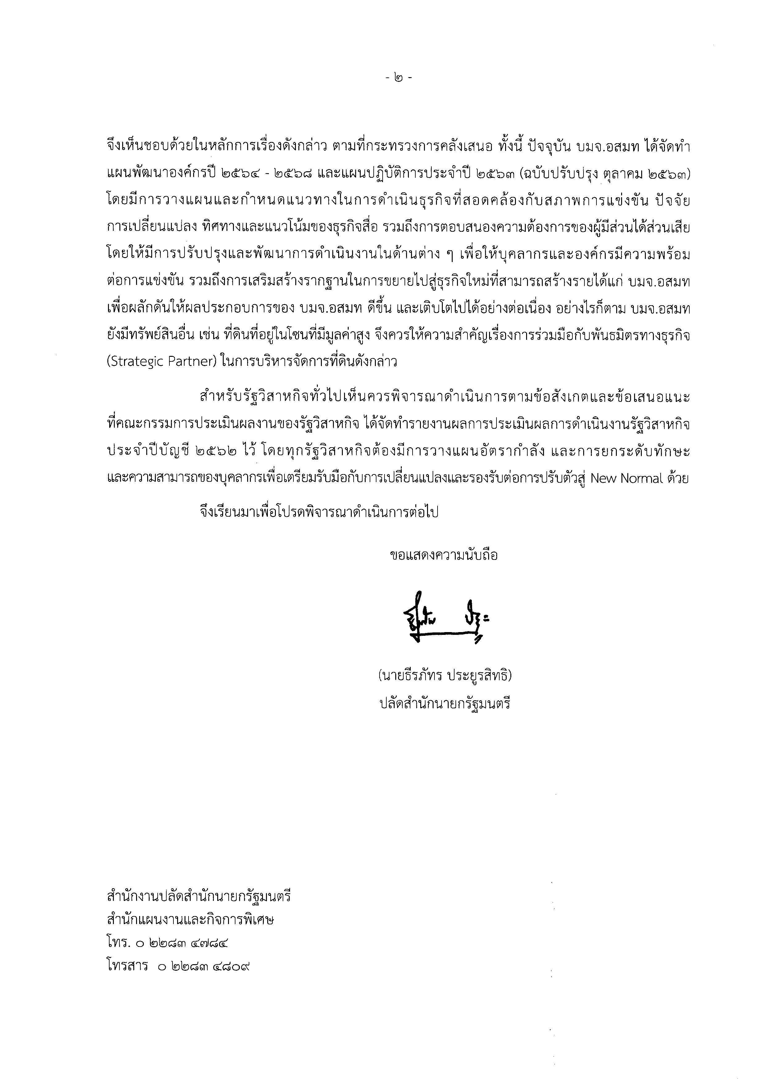 นายธีรภัทร ประยูรสิทธิ ปลัดสำนักนายกรัฐมนตรี มีหนังสือด่วนที่สุด ที่นร 0111/1827 ลงวันที่ 30 พ.ย.2563 แจ้งครม.ผ่านเลขาธิการคณะรัฐมนตรี เพื่อประกอบการพิจารณาของที่ประชุมครม.เมื่อวันที่ 22 ธ.ค.2563 โดยระบุว่า สำนักนายกรัฐมนตรี ได้พิจารณาในประเด็นดังกล่าวและเห็นว่า