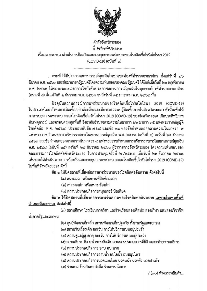 ขณะที่เมื่อวันที่ 26 ธ.ค.ที่ผ่านมา ผู้ว่าราชการจังหวัดระยอง ได้ประกาศให้ อ.เมืองระยอง จ.ระยอง เป้นพื้นที่ควบคุมสูงสุด พร้อมลงนามในคำสั่งปิดสถานที่เสี่ยงต่อการแพร่ระบาด รวม 18 แห่ง ส่วนในอำเภออื่นๆ สถานบริการ ผับ บาร์ สถานบันเทิง เปิดบริการได้ถึงเวลา 24.00 แต่ให้ปิดบริการสนามมวย สนามชนไก่ และสถานประกอบการสนุกเกอร์ ร่วมด้วย ทั้งนี้ให้มีผลตั้งแต่วันที่ 28 ธ.ค.เป็นต้นไป